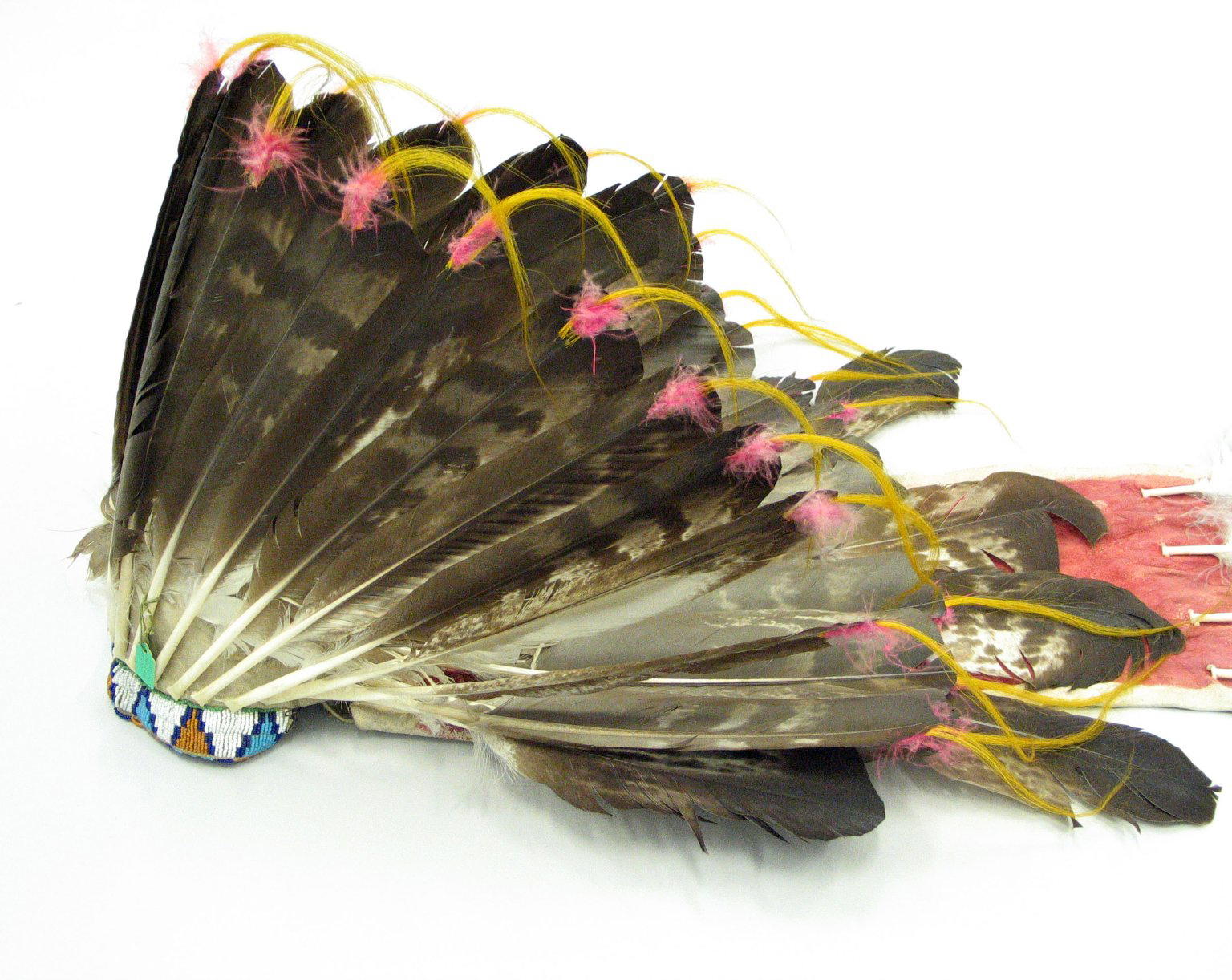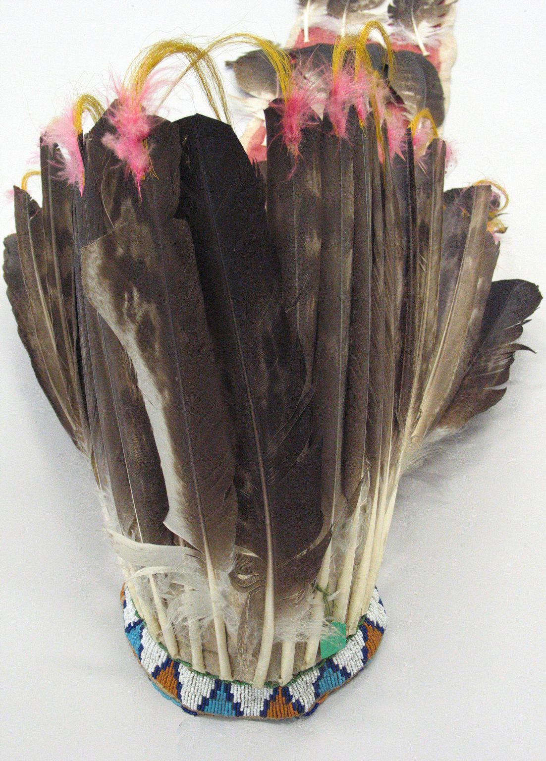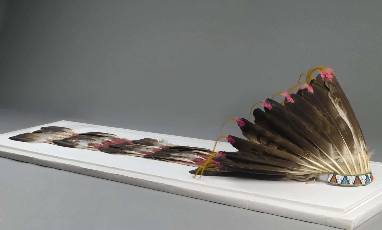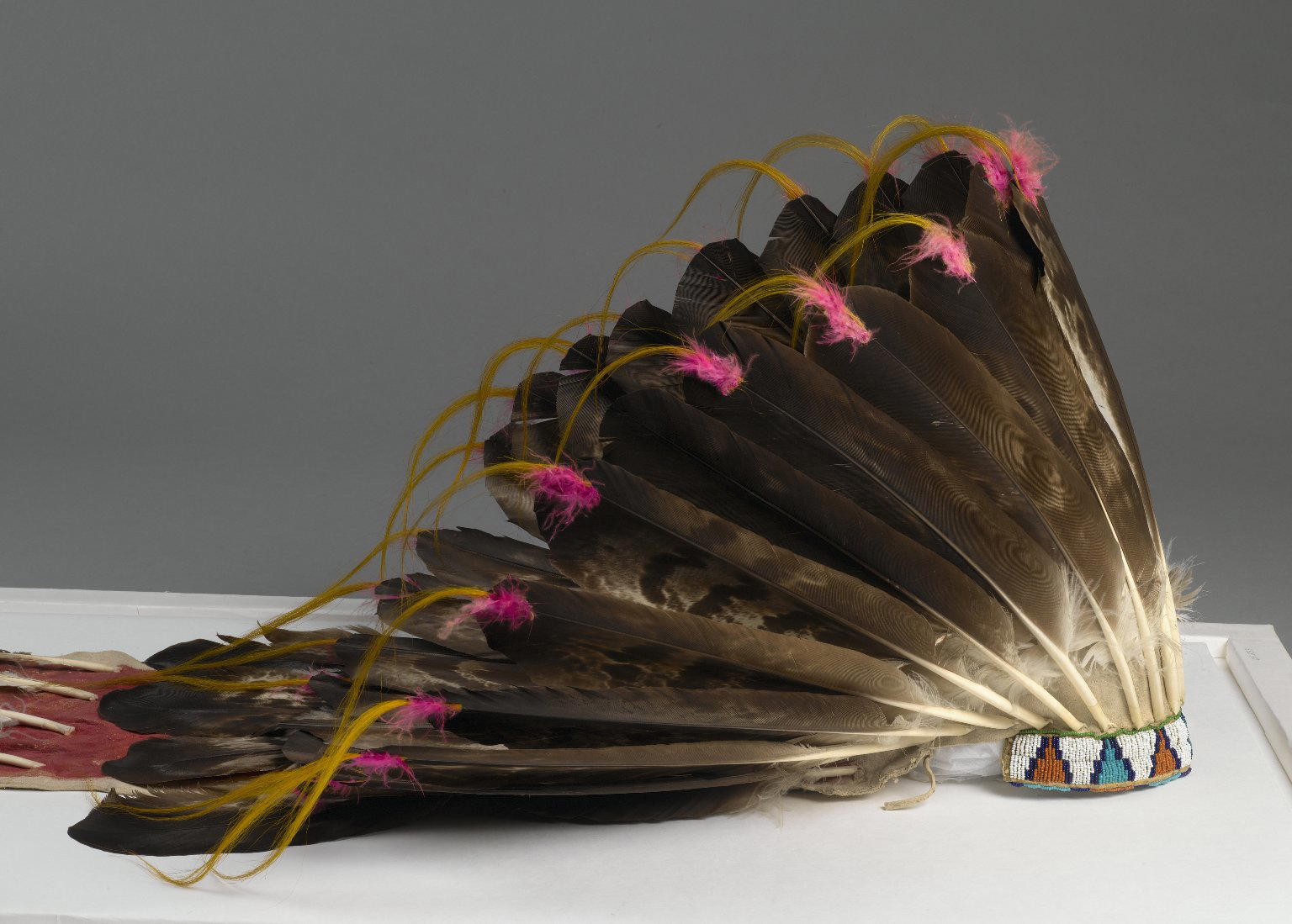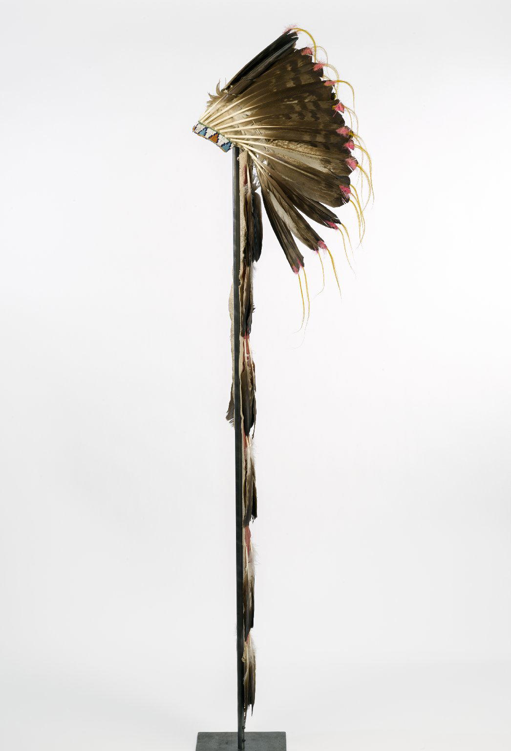 Sioux; or Cheyenne. Headdress or Feathered Bonnet, late 19th–early 20th century. Feathers, beads, pigment, hide,dyed horsehair, 68 1/2 x 8 7/16in. (174 x 21.5cm). Brooklyn Museum, Brooklyn Museum Collection, 05.553. (Photo: Brooklyn Museum)