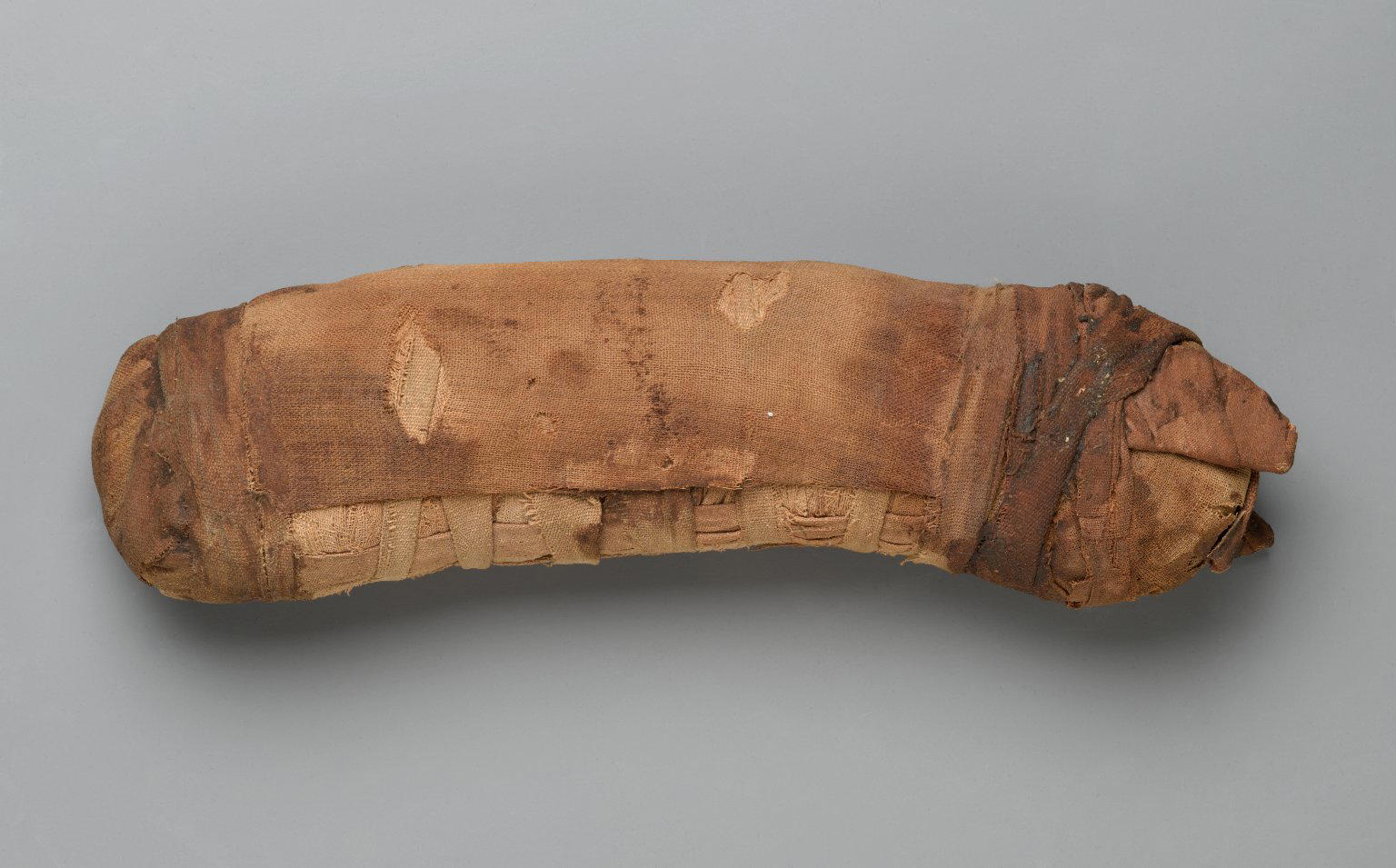Egyptian. Bundle in Form of Cat Mummy, 664–30 B.C.E.. Linen, stones, soil, plant matter, 2 1/8 x 3 x 10 3/8 in. (5.4 x 7.6 x 26.4 cm). Brooklyn Museum, Brooklyn Museum Collection, X1179.3. (Photo: Brooklyn Museum)