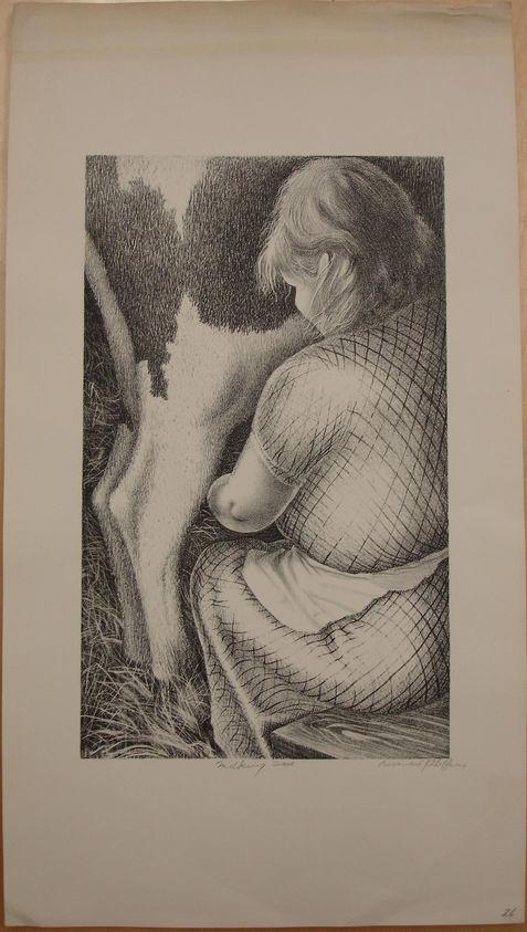 Bernard Joseph Steffen (American, 1907–1980). Milking Time, n.d.. Lithograph, Sheet: 16 13/16 x 9 5/16 in. (42.7 x 23.7 cm) Image: 10 7/8 x 6 1/2 in. (27.6 x 16.5 cm). Brooklyn Museum, Brooklyn Museum Collection, X1042.143. (Photo: Brooklyn Museum)