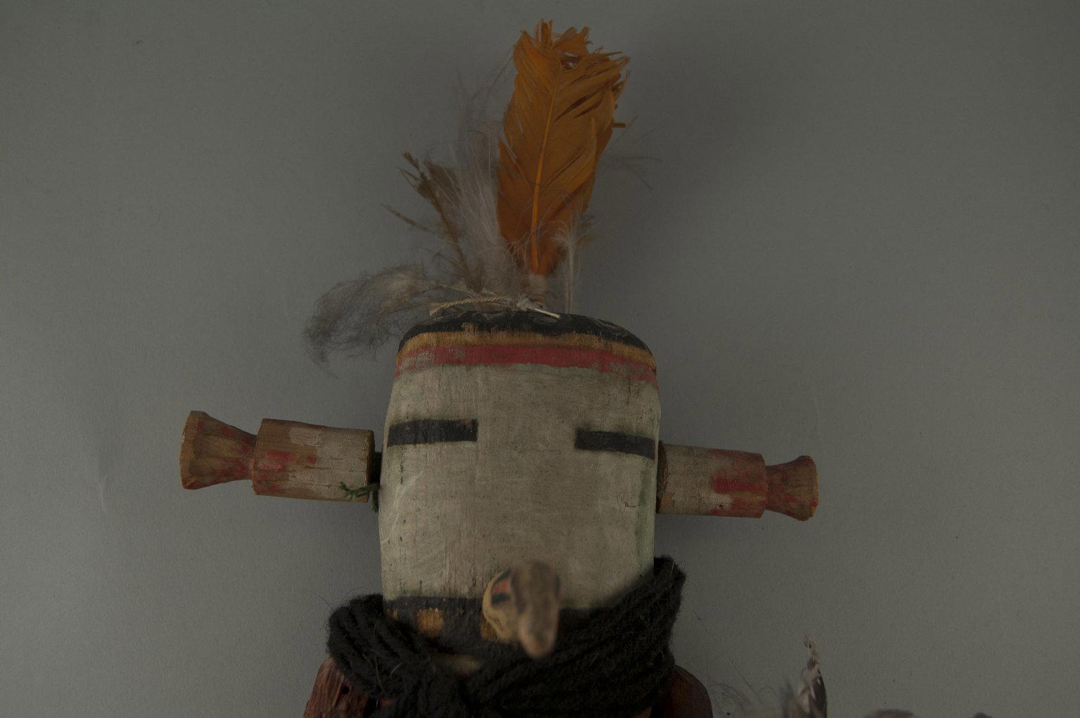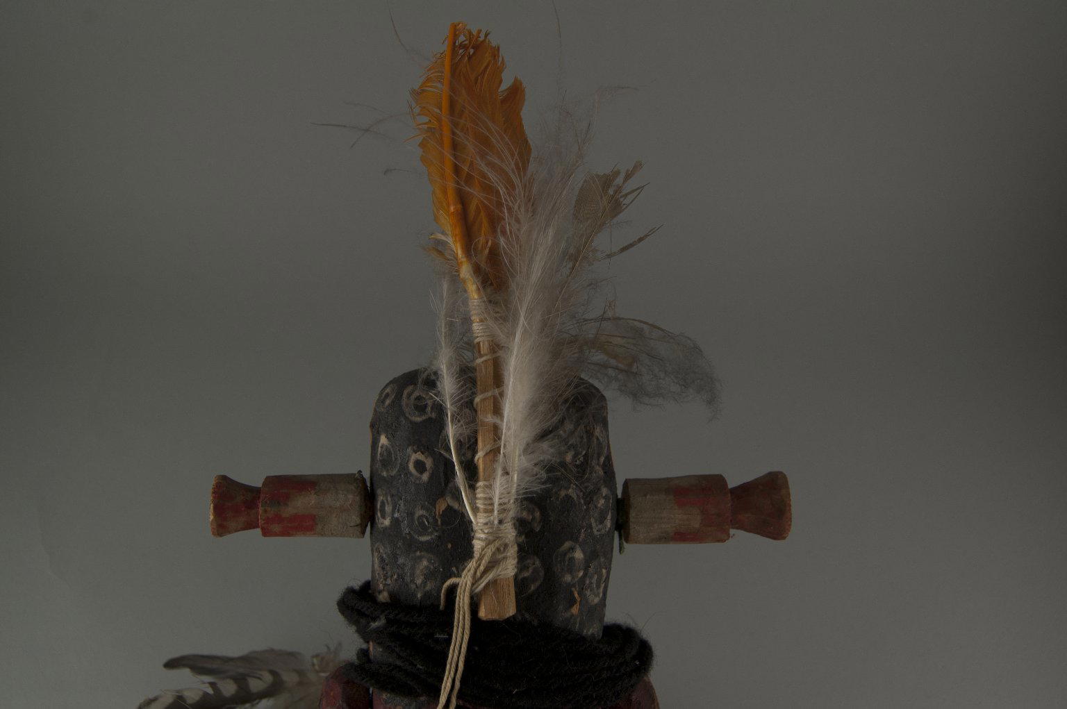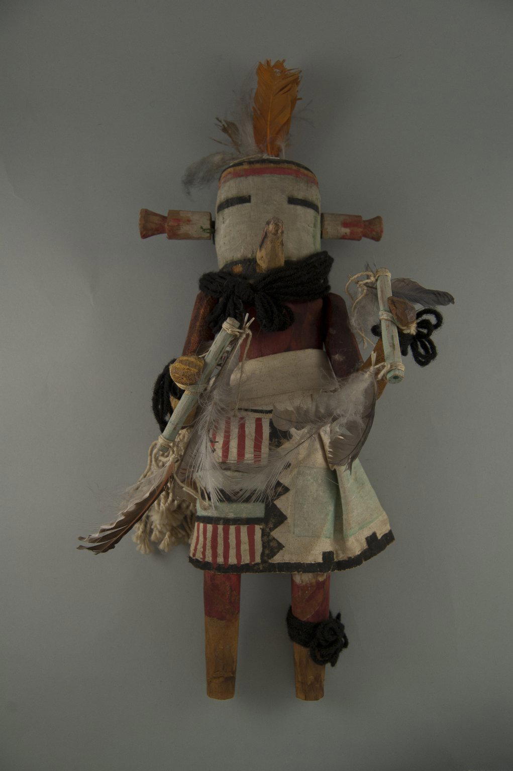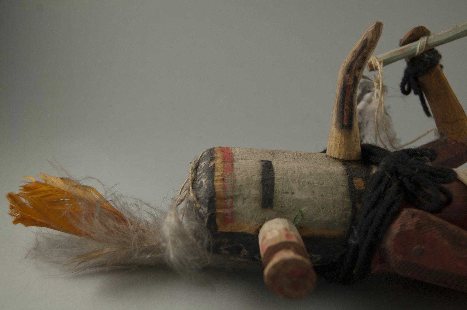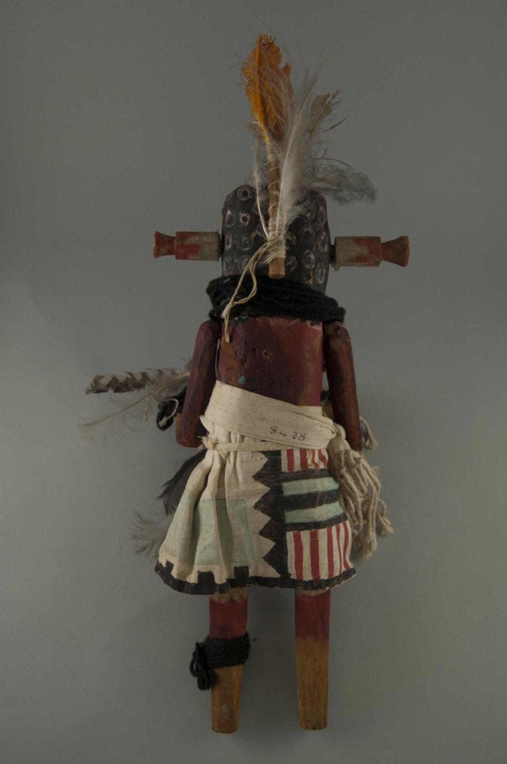 A:shiwi (Zuni Pueblo). Kachina Doll (Kuku-sheleh), late 19th century. Wood, cotton cloth, feathers, pigment,wool, 5 1/8 x 5 3/16 x 13 11/16in. (13 x 13.2 x 34.7cm) mount (dims when using 2015-designed mount): 16 3/4 x 7 3/4 x 4 1/8 in. (42.5 x 19.7 x 10.5 cm). Brooklyn Museum, Museum Expedition 1907, Museum Collection Fund, 07.467.8438. (Photo: Brooklyn Museum)