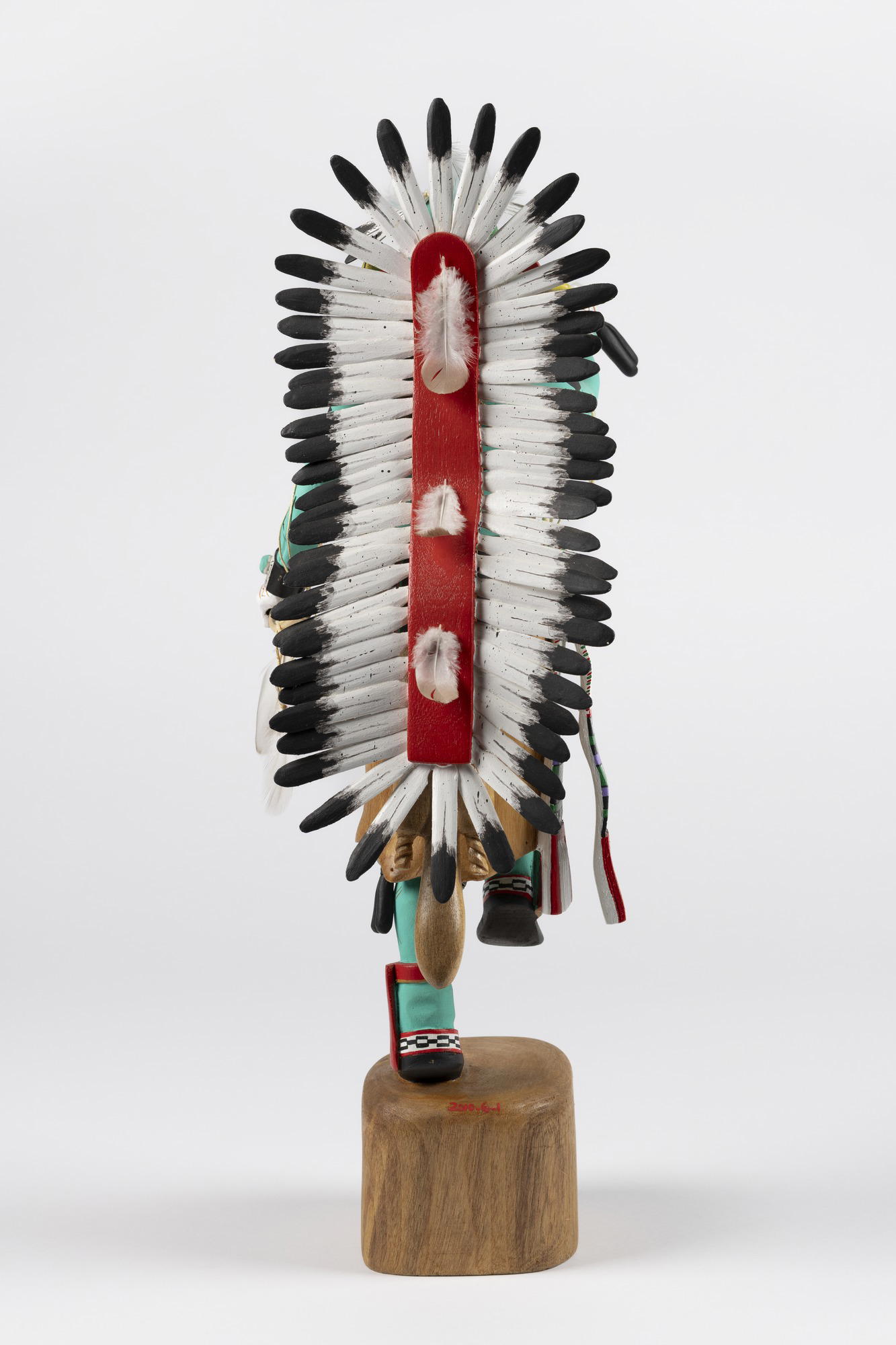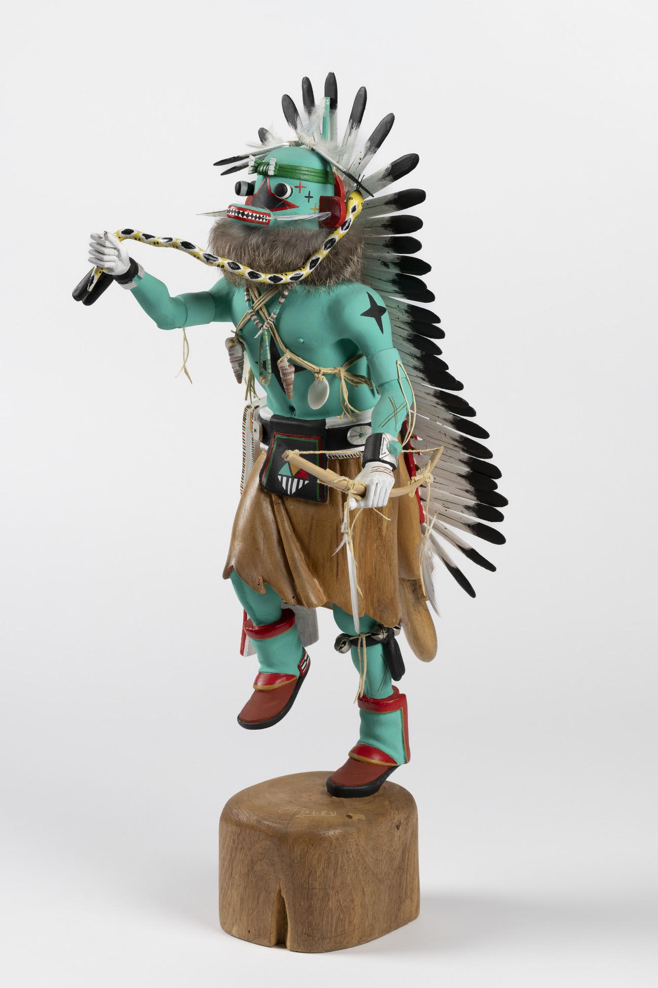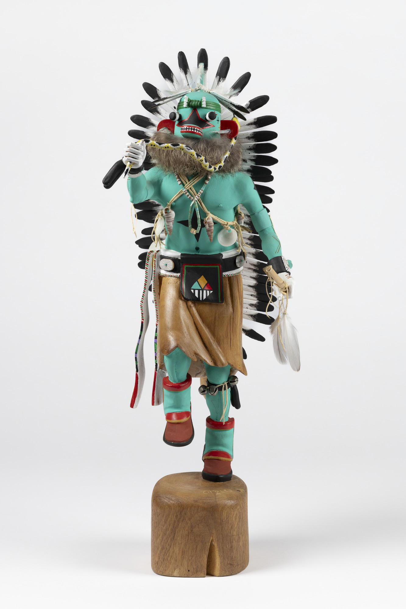 Orin Poley; Pueblo, Hopi. Kachina Doll (Sakwahote), 1960–1970. Cottonwood root, acrylic pigment, hide, feathers, shell, fur, turquioise, metal, 17 3/4 x 6 x 9 in. (45.1 x 15.2 x 22.9 cm). Brooklyn Museum, Gift of Edith and Hershel Samuels, 2010.6.1. (Photo: Brooklyn Museum)