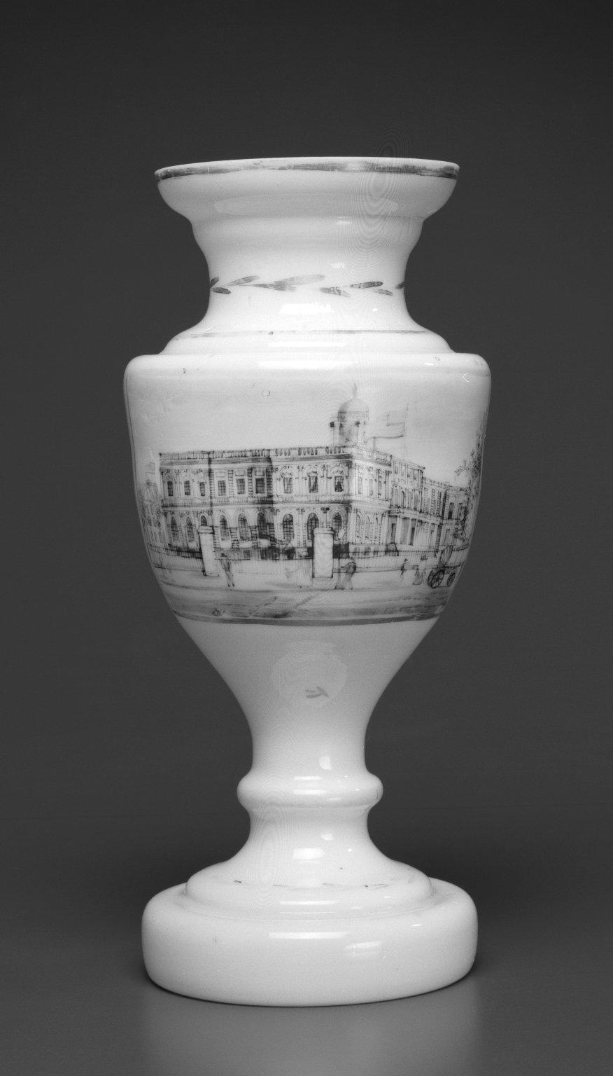 On rare occasions, the transfer-printing technique was used to decorate commemorative objects in glass, as in this extraordinary vase with an image of City Hall in New York. Designed by Joseph Mangin and John McComb, Jr., and opened in 1812, the building was considered one of the most impressive architectural landmarks in Federal-era Manhattan.