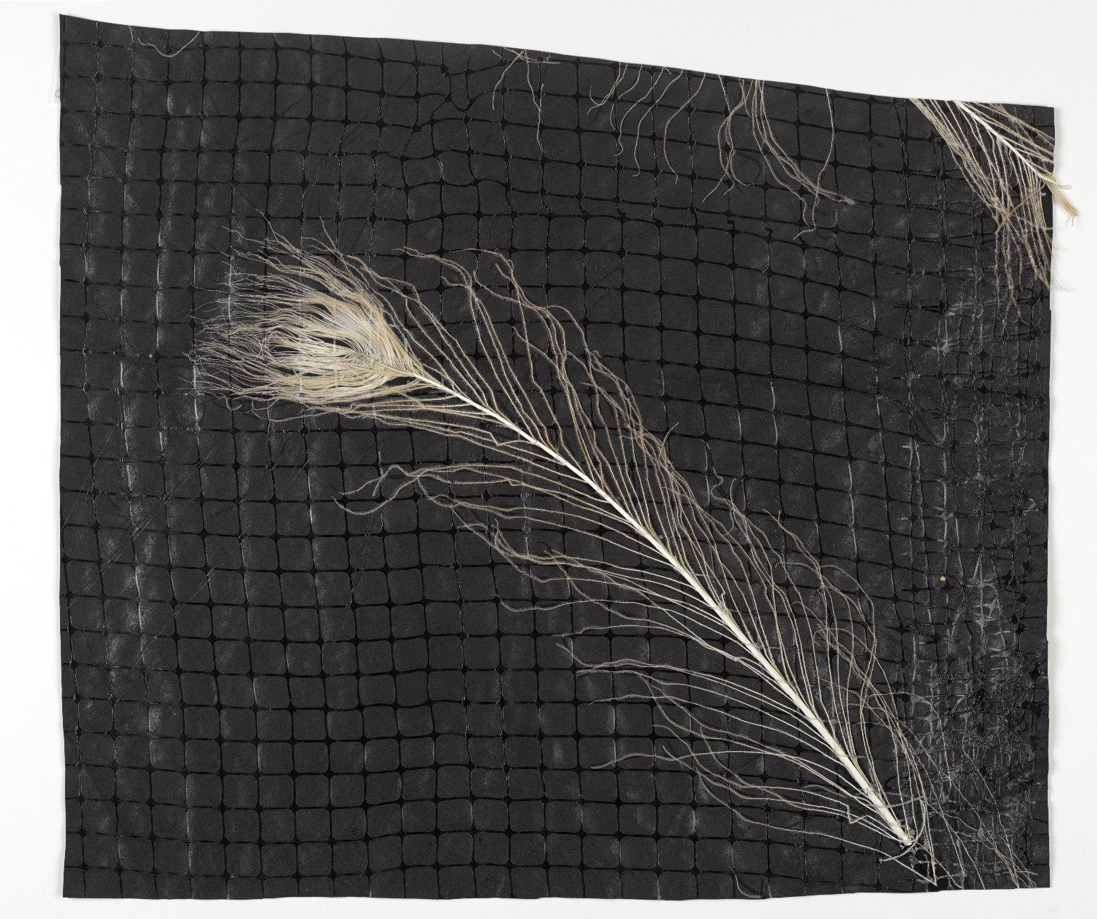 Aviva Stanoff (American, born 1972). Fossilized Peacock, 2002. Ultrasuede and deer netting with albino peacock, 19 1/4 x 17 1/8 in. (48.9 x 43.5 cm). Brooklyn Museum, Gift of the artist in memory of David Pichler , 2011.19.8. © Aviva Stanoff. (Photo: Brooklyn Museum)