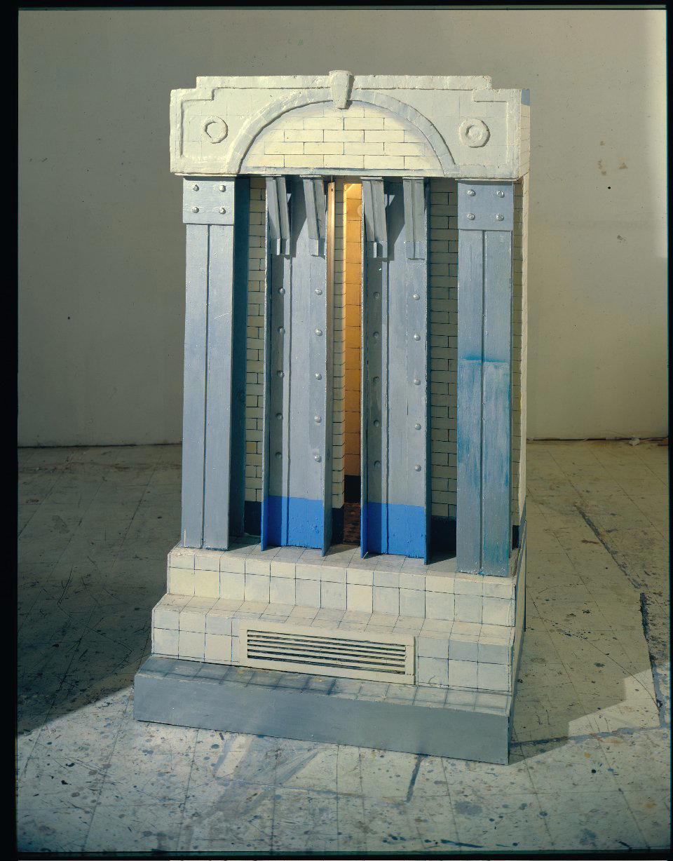Donna Dennis (American, born 1942). Subway with Lighted Interior, 1974. Mixed media (wood, acrylic and enamel paint, masonite, incandescent light, florescent light fixture unit, cellulose compound, charcoal and graphite), 75 x 43 x 32 in. (190.5 x 109.2 x 81.3 cm). Brooklyn Museum, Gift of Thomas and John Solomon, 2011.56. © Donna Dennis. (Photo: Courtesy of Thomas Solomon Gallery)