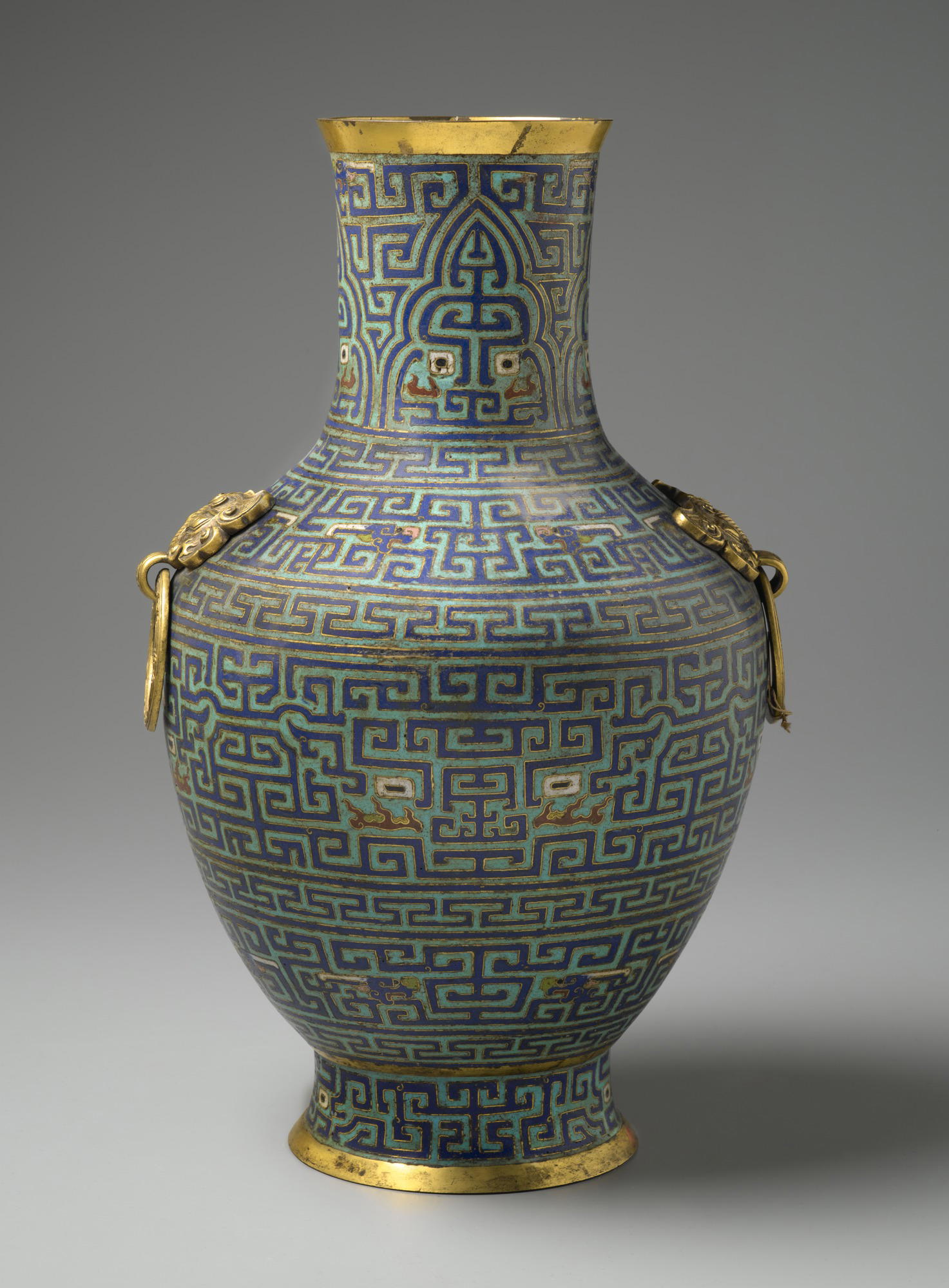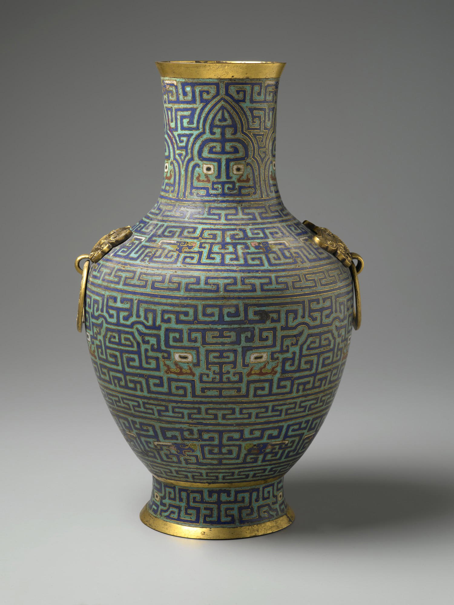 Vase, 18th century. Cloisonné enamel on copper alloy, gilt bronze, 16 1/2 x 10 1/2 x 10 in., 9.5 lb. (41.9 x 26.7 x 25.4 cm, 4.31kg). Brooklyn Museum, Gift of Samuel P. Avery, 09.598. (Photo: Brooklyn Museum)