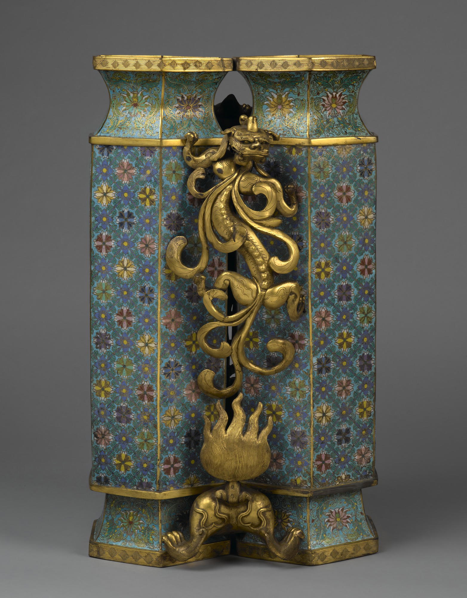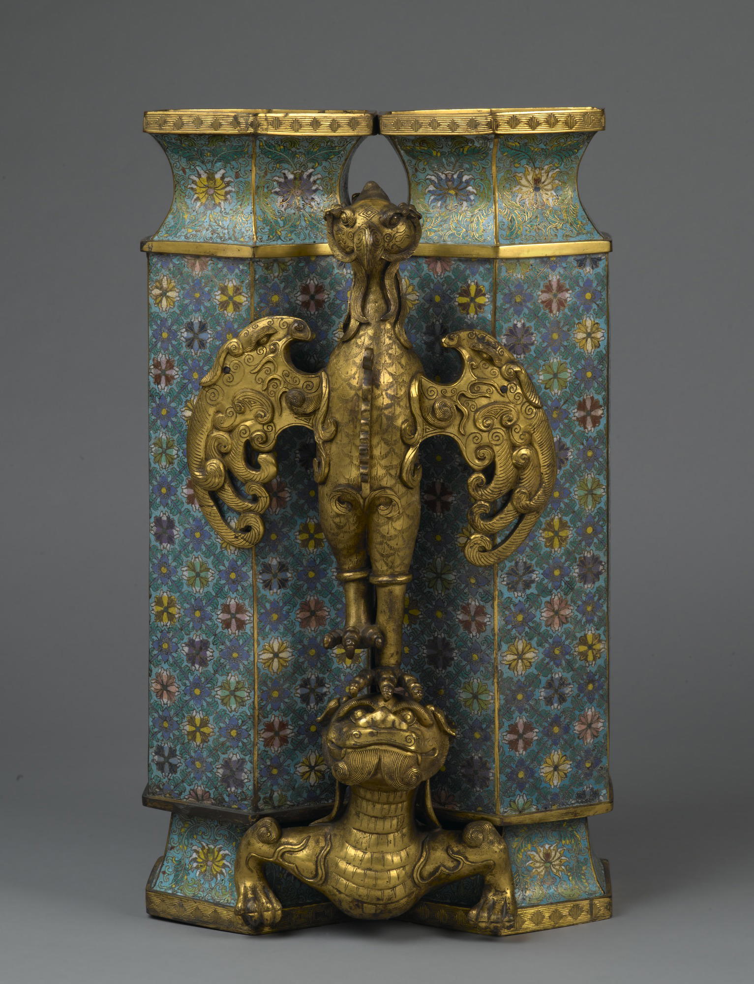 Twin Vases with Carved Stand, 1736–1795. Cloisonné enamel on copper alloy, gilt bronze, 25 1/4 x 15 x 13 in., 74.5 lb. (64.1 x 38.1 x 33 cm, 33.79kg). Brooklyn Museum, Gift of Samuel P. Avery, 09.606a-b. (Photo: Brooklyn Museum)