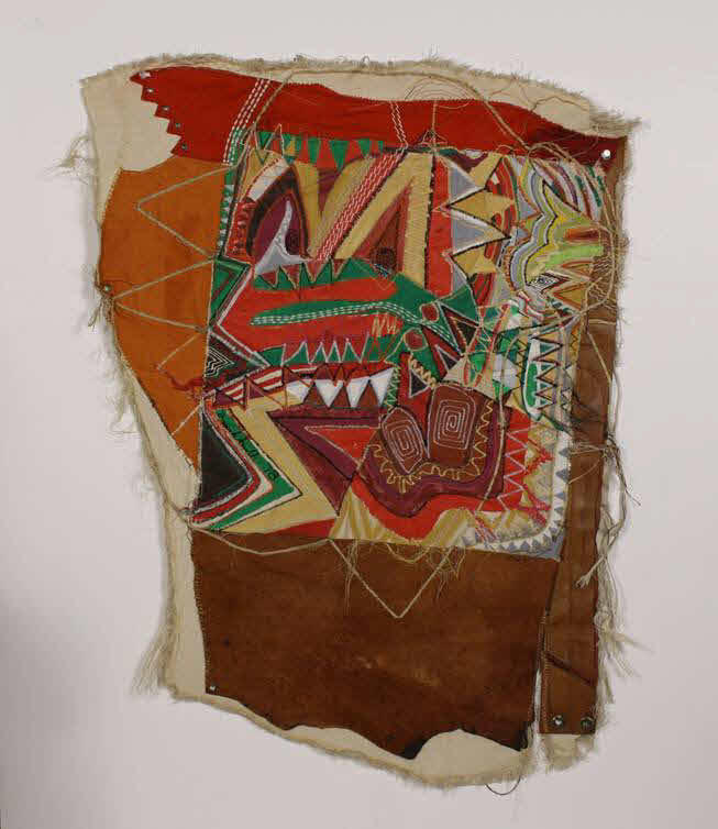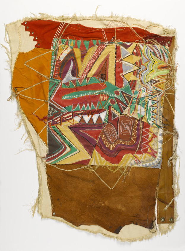 Frank Smith (American, born 1935). Banner for a New Black Nation, 1978. Fabric, leather, suede, paint, thread, metallic covered thread, graphite, metal rivets, 37 × 27 × 1/4 in. (94 × 68.6 × 0.6 cm). Brooklyn Museum, Gift of R.M. Atwater, Anna Wolfrom Dove, Alice Fiebiger, Joseph Fiebiger, Belle Campbell Harriss, and Emma L. Hyde, by exchange, Designated Purchase Fund, Mary Smith Dorward Fund, Dick S. Ramsay Fund, and Carll H. de Silver Fund, 2012.80.40. (Photo: Brooklyn Museum)