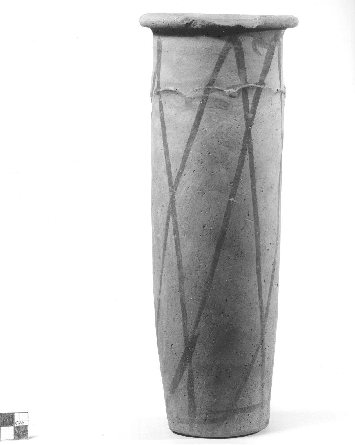 Wavy Handled Cylindrical Vase with Painted Basket Decoration, ca. 4400–3100 B.C.E.. Terracotta, pigment, 11 5/8 x 4 1/2 in. (29.5 x 11.4 cm). Brooklyn Museum, Charles Edwin Wilbour Fund, 09.889.669. (Photo: Brooklyn Museum)