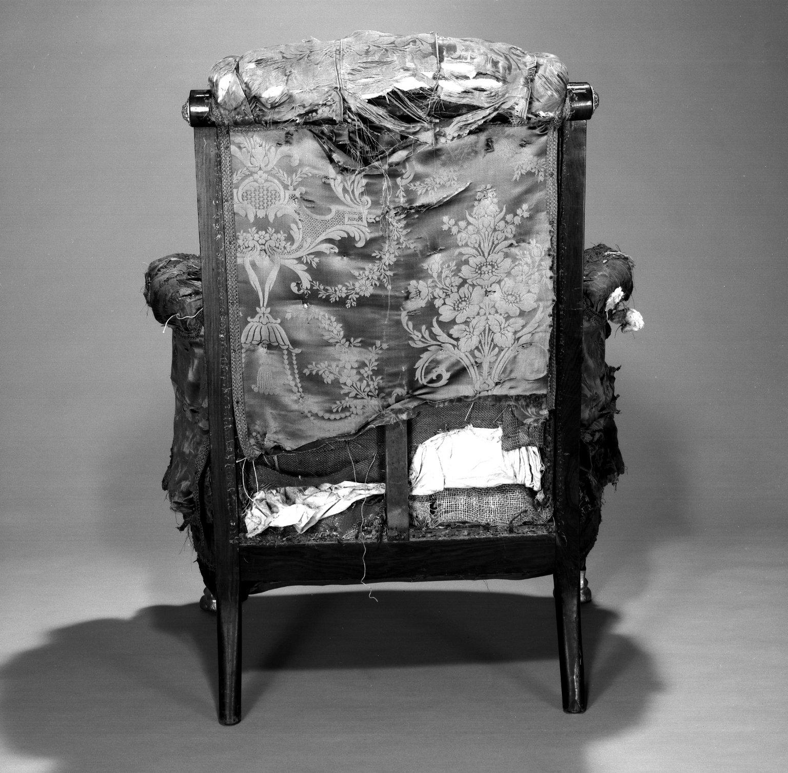 The form of this easy chair, or bergère in French, was introduced in France in about 1725 and has remained popular. To preserve the chair as a rare original upholstery document, later layers of upholstery and padding (see illustration) were removed to uncover the original upholstery on the back and arms. The original green silk damask upholstery was cleaned in place. A modern, unfigured, green silk was used to cover the seat and front of the chair, and was set behind the original damask to compensate for losses on the back and arms. All the trim on the chair is modern, but it approximates what was originally used.