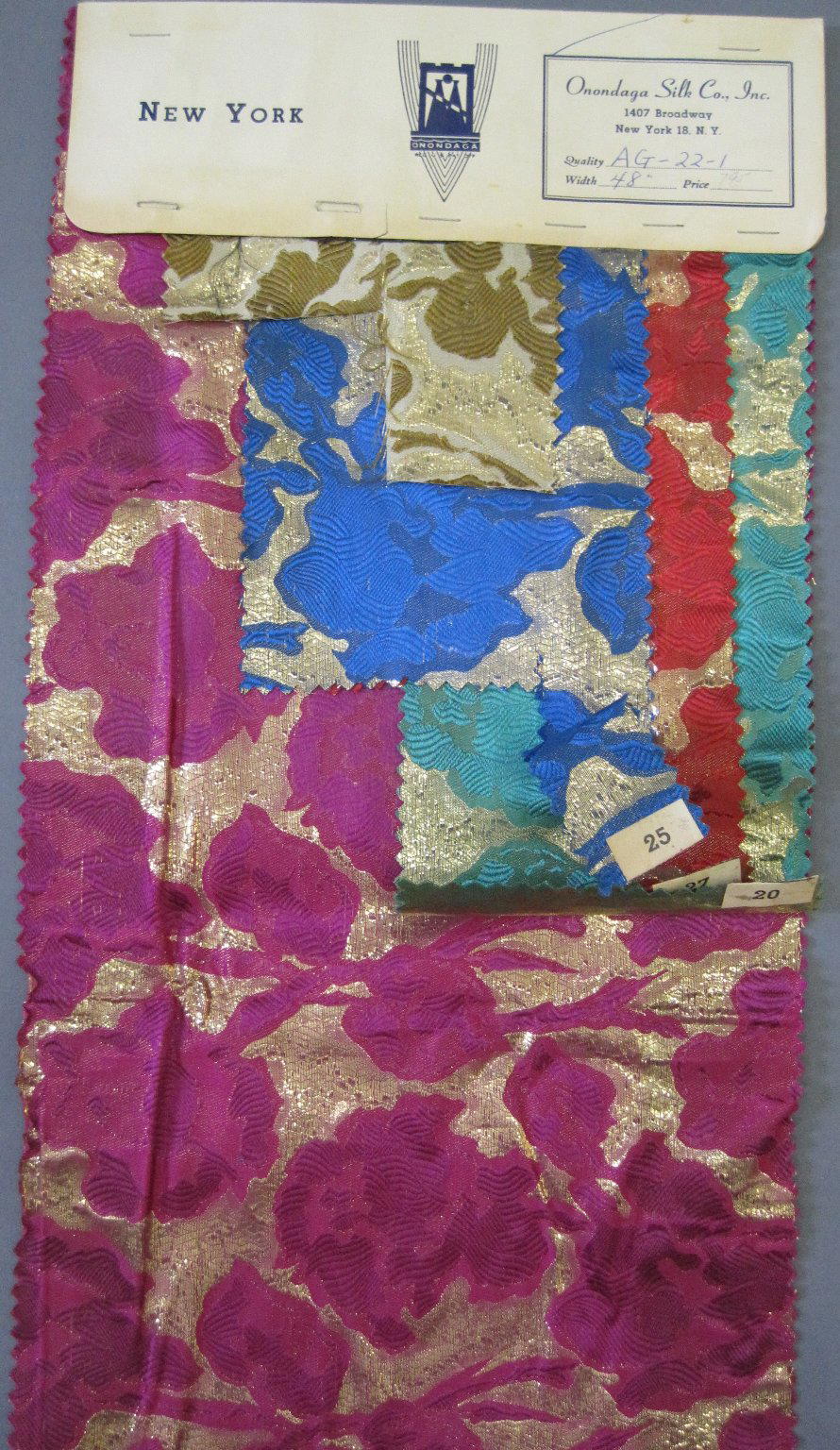Onondaga Silk Company, Inc. (1925–1981). Textile Swatches, 1948–1959. Silk, metal, a: 9 x 23 in. (22.9 x 58.4 cm) b: 4 3/4 x 6 in. (12.1 x 15.2 cm) c,d: 4 3/4 x 11 3/4 in. (12.1 x 29.8 cm) 4 5/8 x 11 3/4 in. (11.7 x 29.8 cm). Brooklyn Museum, Gift of the Onondaga Silk Company, 64.130.3a-e. (Photo: Brooklyn Museum)