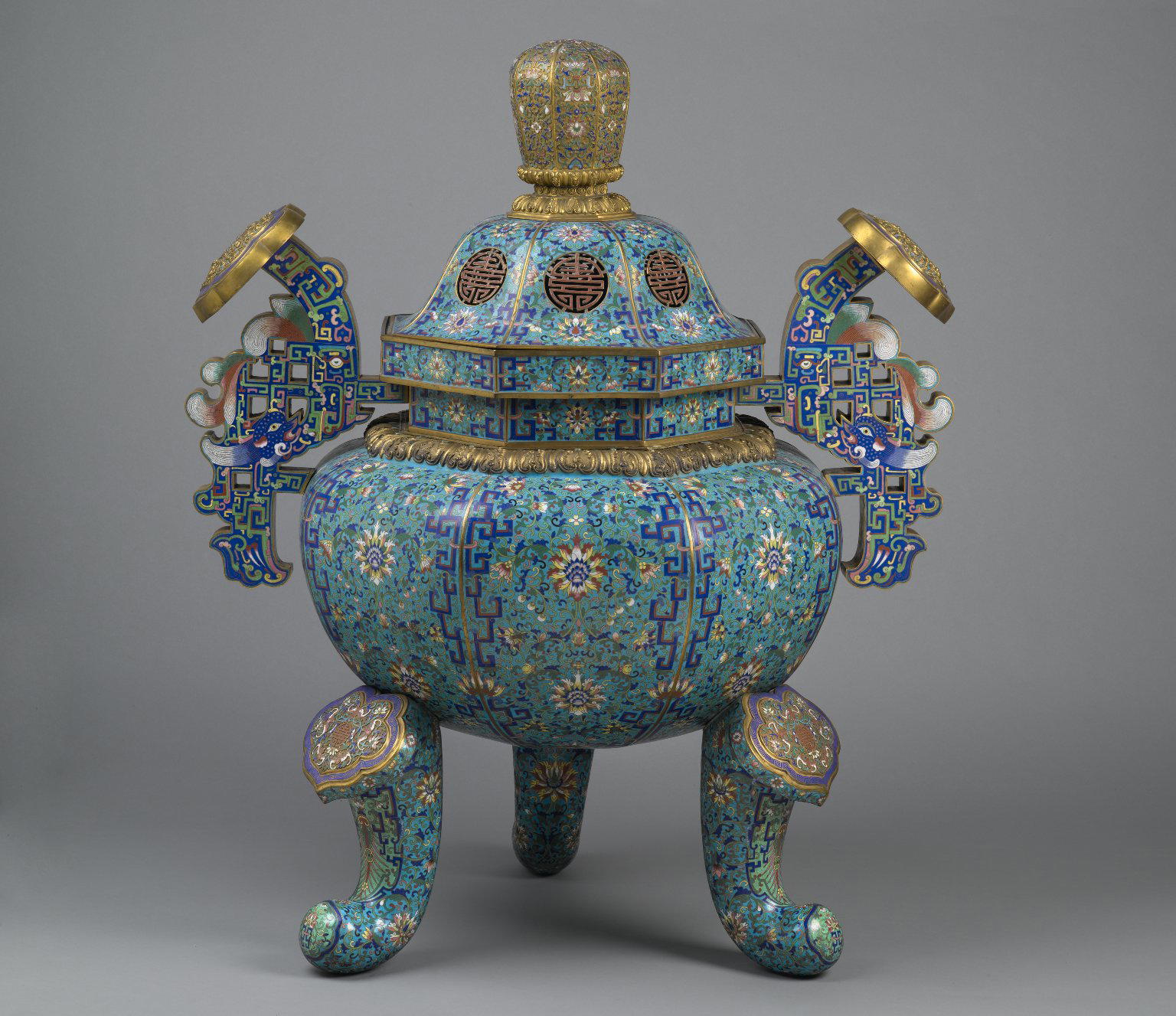 Tripod Censer, late 18th century. Cloisonné and champlevé enamel, 42 × 34 × 27 in., 84 lb. (106.7 × 86.4 × 68.6 cm, 38.1kg). Brooklyn Museum, Gift of Samuel P. Avery, 09.933.1. (Photo: Brooklyn Museum)