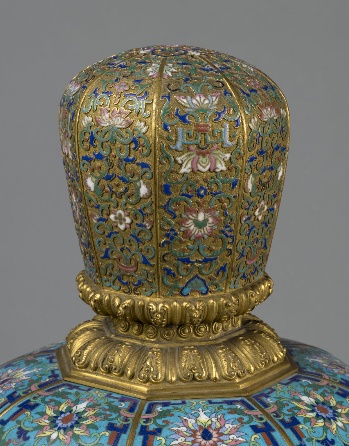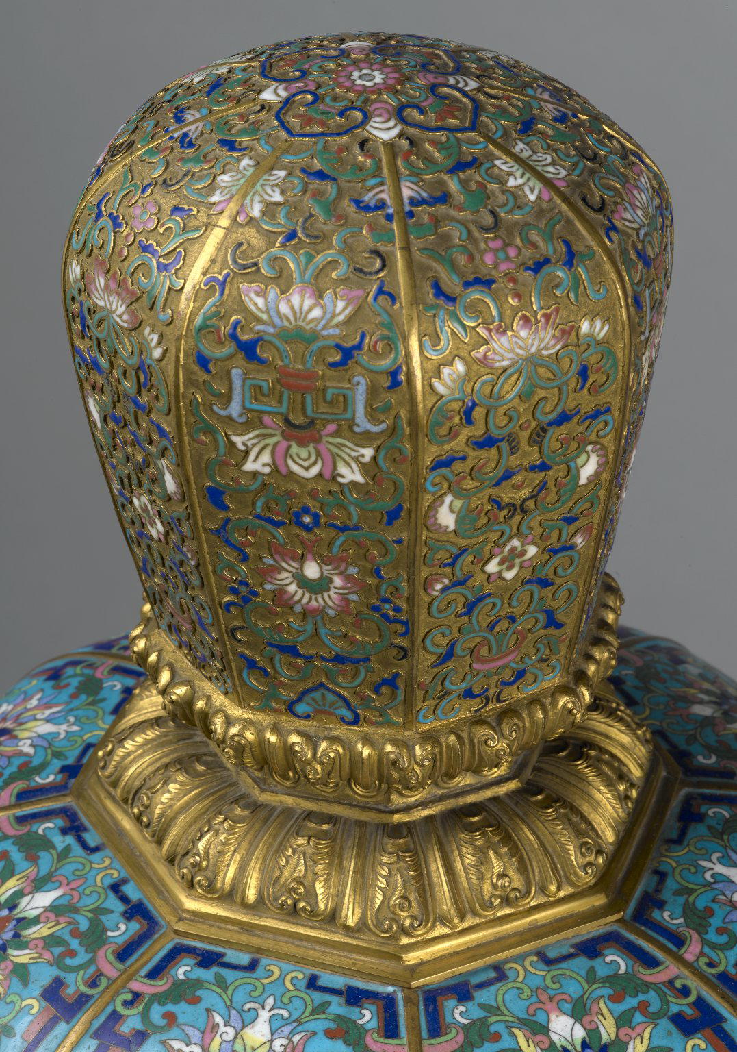 Absolutely! This large and elaborate incense burner was likely made for a Buddhist temple in Qing-dynasty China during the reign of the Qianlong Emperor. The shape reflects an ancient Chinese ritual vessel, a cauldron-like bronze with three legs.It would have originally been part of a set of five vessels, one incense burner (here), two candlesticks and two vases, which would have been placed in front of an altar/shrine in a Buddhist temple.The vessel is covered in auspicious and symbolic motifs. The red characters along the lid, which is where the smoke would have exited from, are "shou," which means longevity. There are also a number of lotus flowers, which are a popular Buddhist motif.What's champleve enamel?