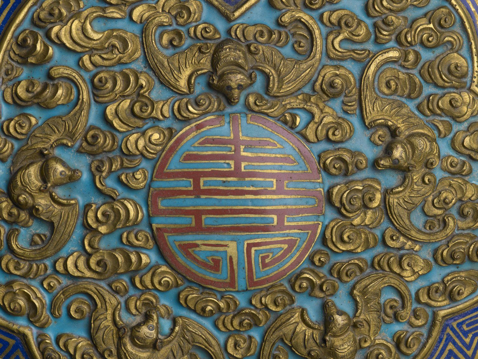 This red symbol is the Chinese character "shou." It means longevity which was (and is) an important concept in Chinese culture so it, understandably, is integrated into Chinese art.Symbols of good luck and prosperity are common in Chinese art. For instance, on the body of this censer you can see the "shou" symbol again surrounded by bats. The word for bat in Chinese, “fu,” is a homophone for the character for good luck and good fortune.That's really interesting!We are curious about the labyrinthine patterns.