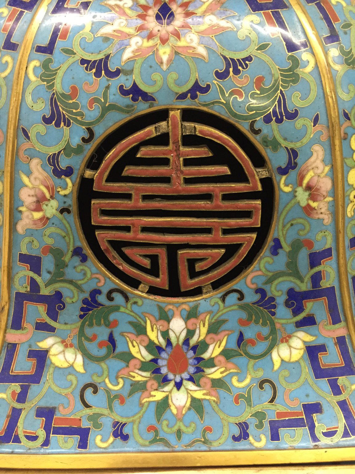 This cloisonné vessel is an incense burner for use in a Buddhist temple or shrine space, which explains why it is so large and decorative. The top of the vessel opens and incense would have been placed inside.If you look closely, you can find the small holes, shaped like the character for long life, where the smoke would come out.Thank you!This is amazing! What was it used for?