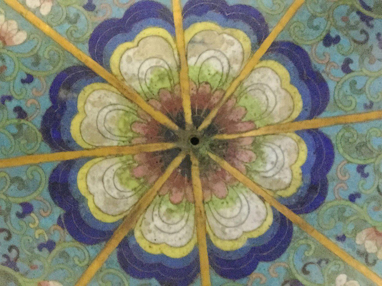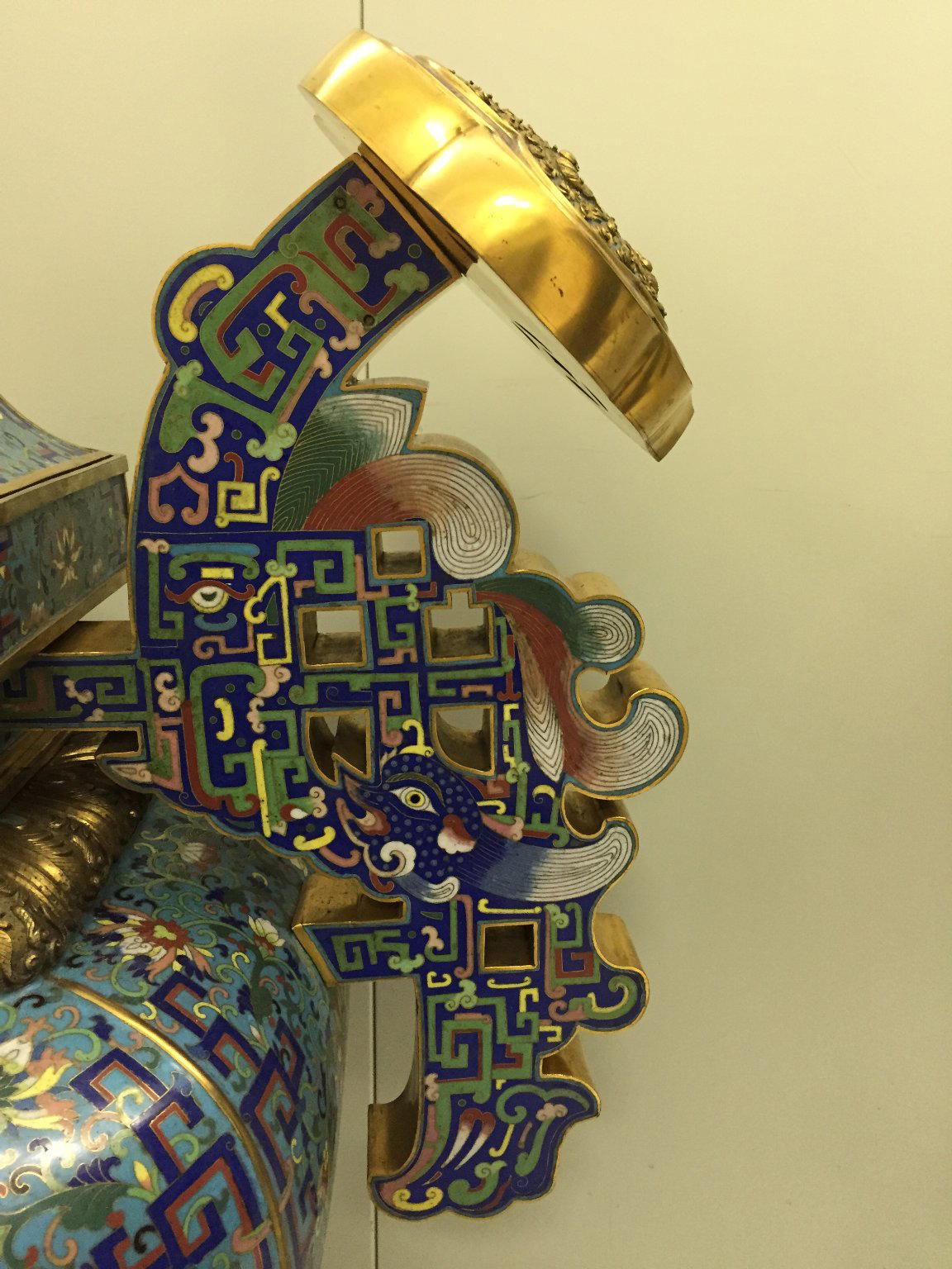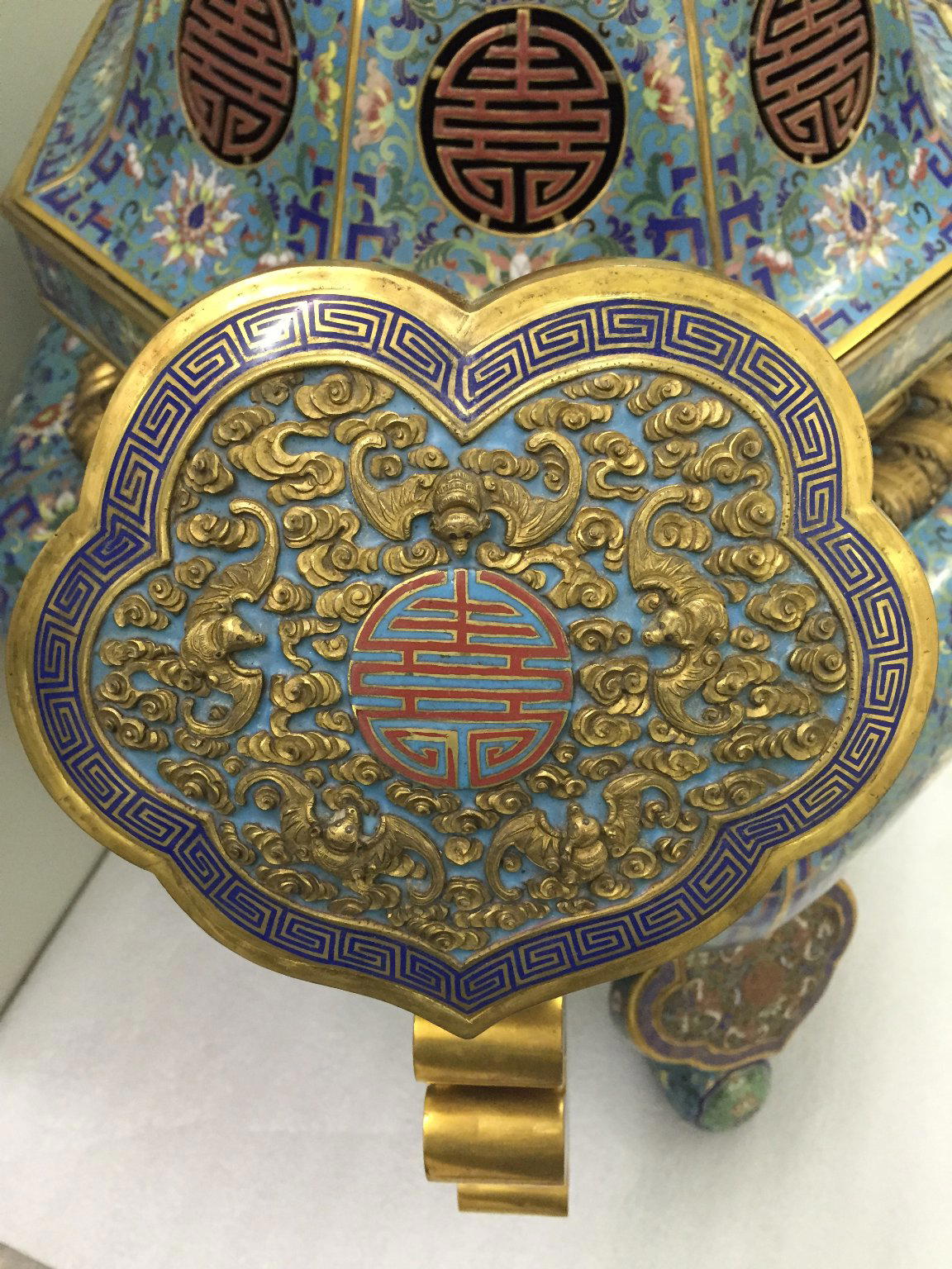 This was one of a set of 5 typical ritual objects that would be placed on a shrine in a Buddhist temple!The process of making cloisonné is very complicated, how long would it take to make this entire piece? Are there examples of even larger cloisonné pieces?