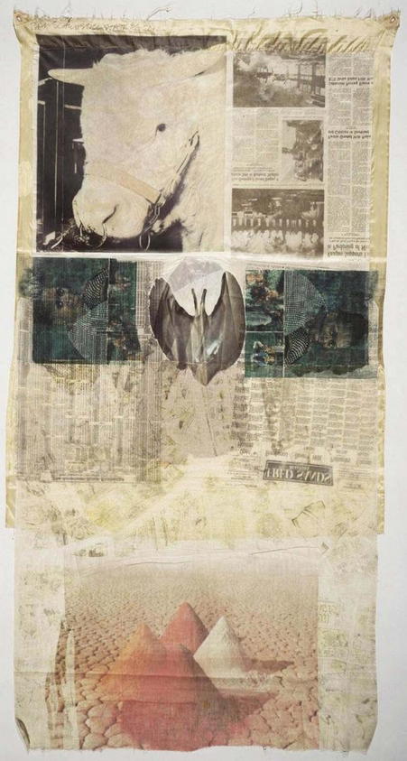 Robert Rauschenberg (American, 1925–2008). Ringer, 1974. Offset lithograph and screenprint, paper bag, cheesecloth, China silk, silk, satin, 70 × 36 in. (177.8 × 91.4 cm). Brooklyn Museum, Gift of Carol and Don Glaser, 2019.43. (Photo: Courtesy of the Robert Rauschenberg Foundation)
