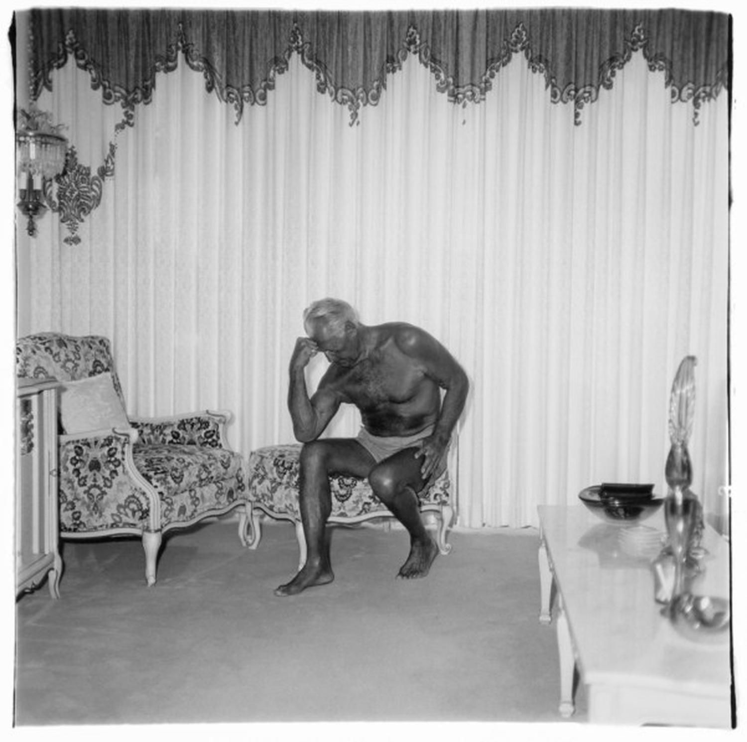 Diane Arbus (American, 1923–1971). Charles Atlas Seated in His Palm Beach Home, Fla., 1969. Gelatin silver print, sheet: 20 × 16 in. (50.8 × 40.6 cm). Brooklyn Museum, Gift of Jeffrey Fraenkel and Frish Brandt, 2019.49.3. (Photo: Courtesy of Fraenkel Gallery)