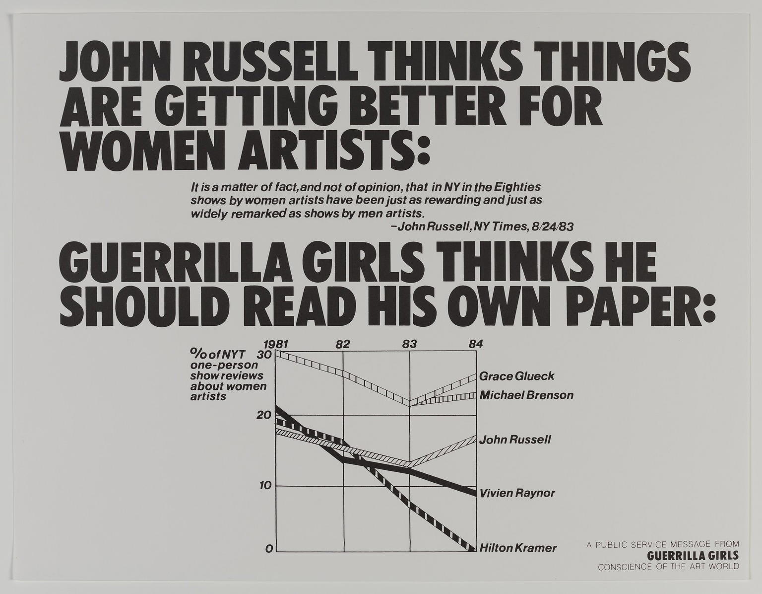 Guerrilla Girls (established United States, 1985). John Russell Thinks Things are Getting Better for Women Artists., 1985. Offset lithograph, 17 × 22 in. (43.2 × 55.9 cm). Brooklyn Museum, Gift of Guerrilla Girls BroadBand, Inc., 2017.26.5. (Photo: Brooklyn Museum)