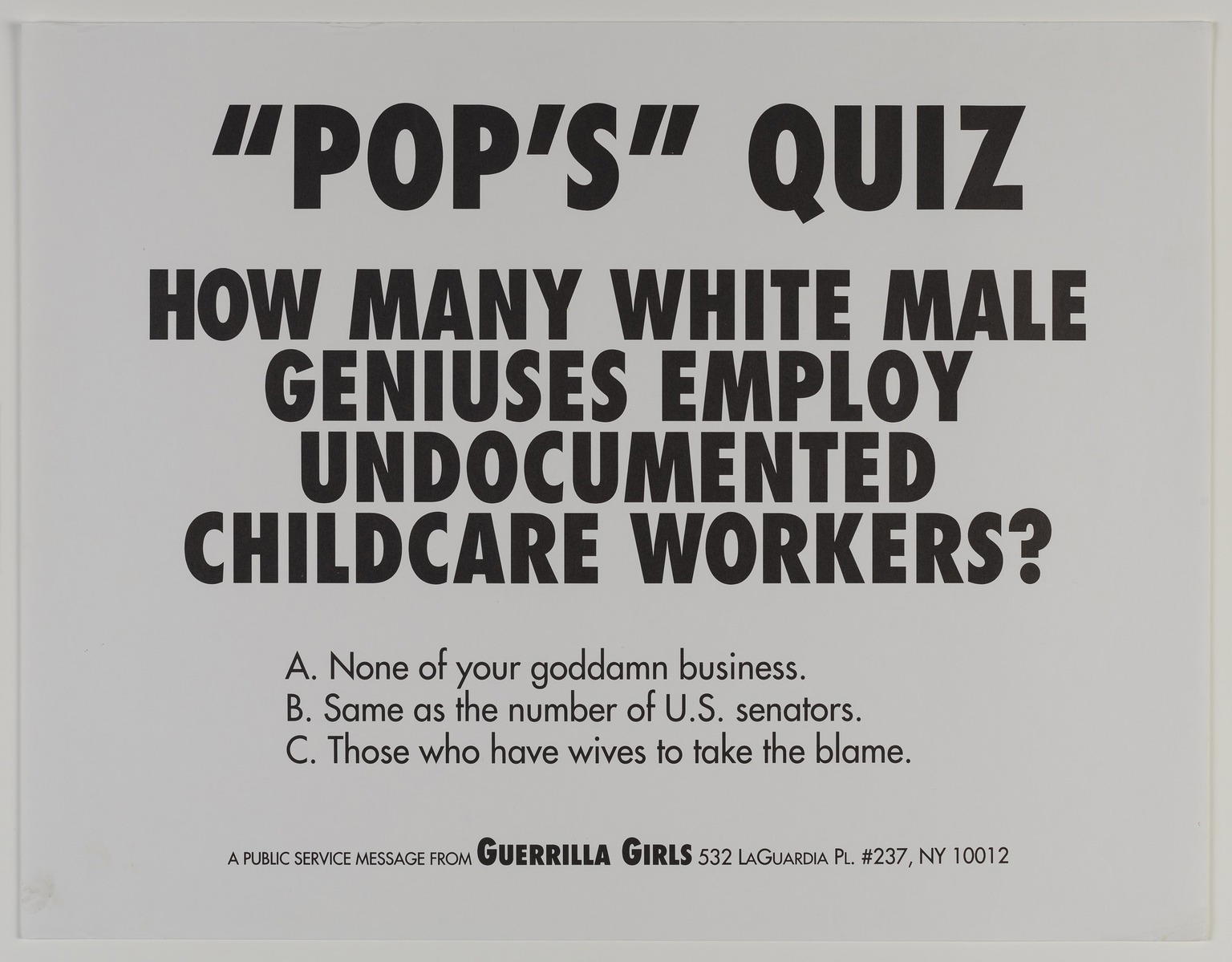 Guerrilla Girls (established United States, 1985). "Pop's" Quiz. How Many White Male Geniuses?, 1999. Offset lithograph, 17 × 22 in. (43.2 × 55.9 cm). Brooklyn Museum, Gift of Guerrilla Girls BroadBand, Inc., 2017.26.48. (Photo: Brooklyn Museum)