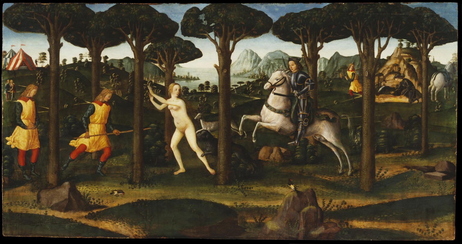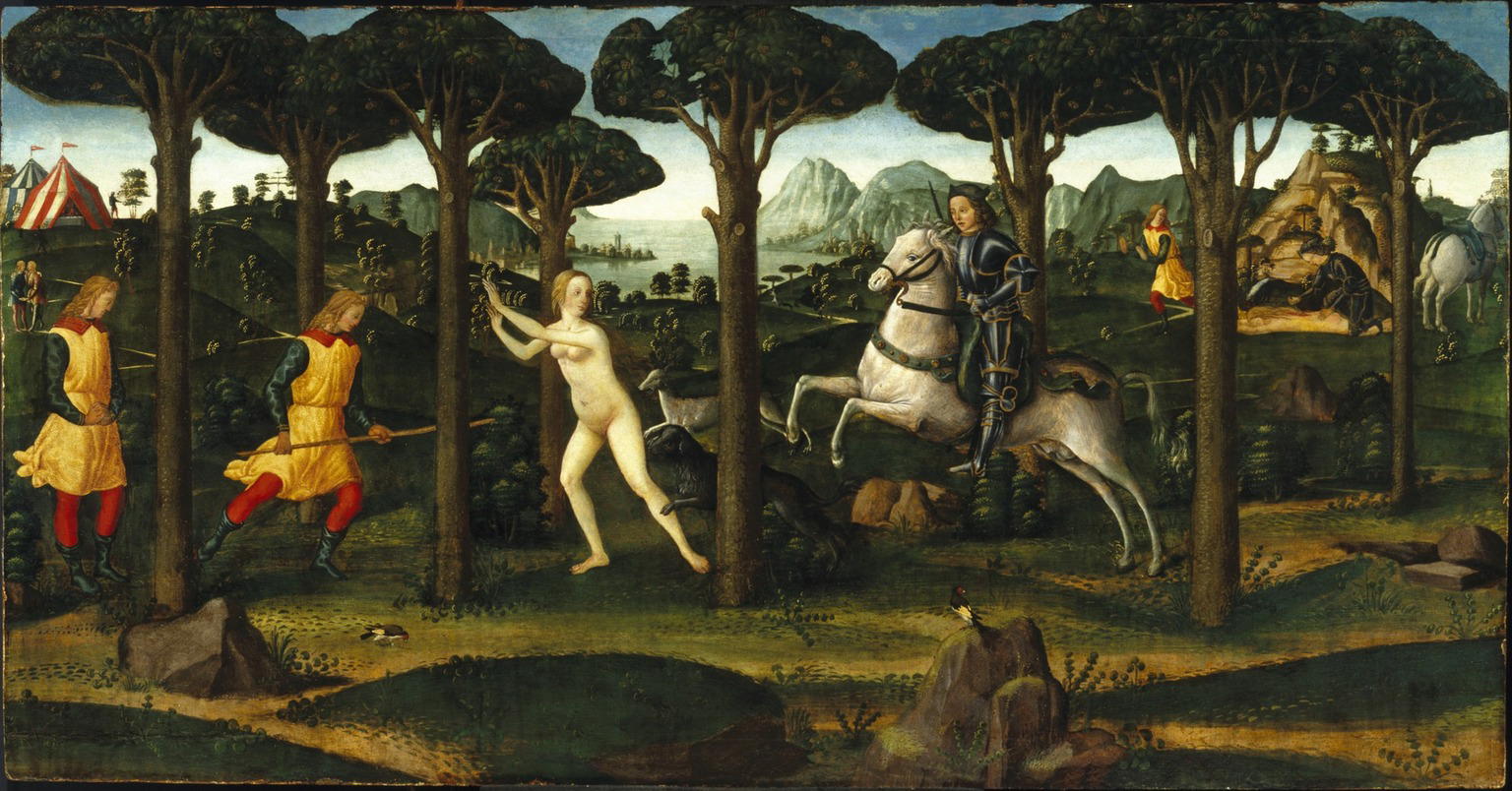Davide di Tommaso Bigordi, aka Davide Ghirlandaio (Italian, Florentine, 1452–1525). Forest Scene from the Tale of Nastagio degli Onesti, in Boccaccio's "Decameron", after 1483. Tempera on wood panel, 27 1/2 × 53 in. (69.9 × 134.6 cm) frame: 36 × 62 × 3 in. (91.4 × 157.5 × 7.6 cm). Brooklyn Museum, A. Augustus Healy Fund and Carll H. de Silver Fund, 25.95. (Photo: Brooklyn Museum)