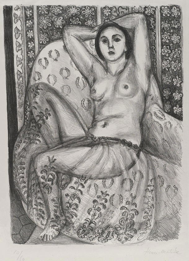 Henri Matisse (Le Cateau–Cambrésis, France, 1869 – 1954, Nice, France). L'Odalisque, 1924. Lithograph on laid paper, Image: 14 3/8 x 10 3/8 in. (36.5 x 26.4 cm) Sheet: 20 1/4 x 14 3/4 in. (51.4 x 37.5 cm). Brooklyn Museum, Museum Collection Fund, 25.123. (Photo: Brooklyn Museum)