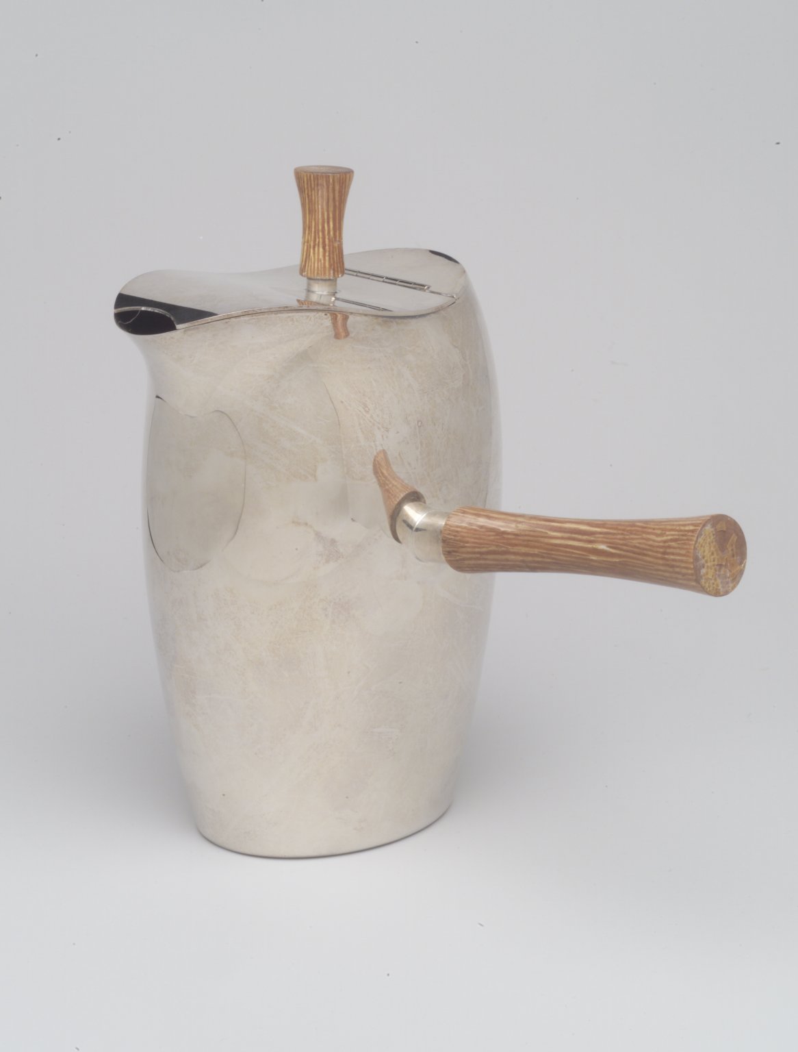Niagra Falls Silver Co., a Division of Oneida Silversmiths (1877 to present). Coffee Pot, from Three Piece Coffee Service, Heirloom Line, ca. 1955. Silverplate, wood, 8 3/8 x 5 3/8 x 3 in. (21.3 x 13.7 x 7.6 cm). Brooklyn Museum, Gift of Jewel Stern, 2003.11.2. (Photo: Brooklyn Museum)