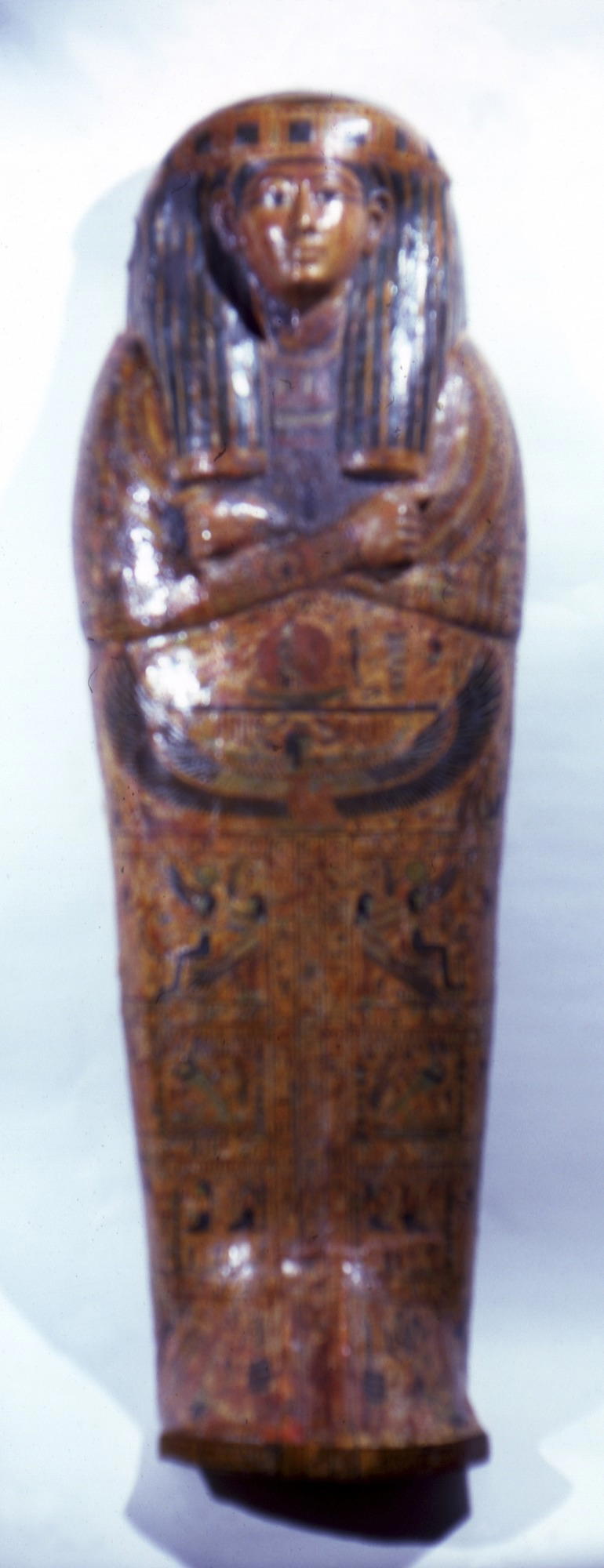 The damage to the painted surface on the left side of the coffin has been left unrepaired to reveal how the carpenters pinned smaller pieces of wood together with wooden pegs to make a coffin. Artists then plastered and painted the surface to make it appear smooth.