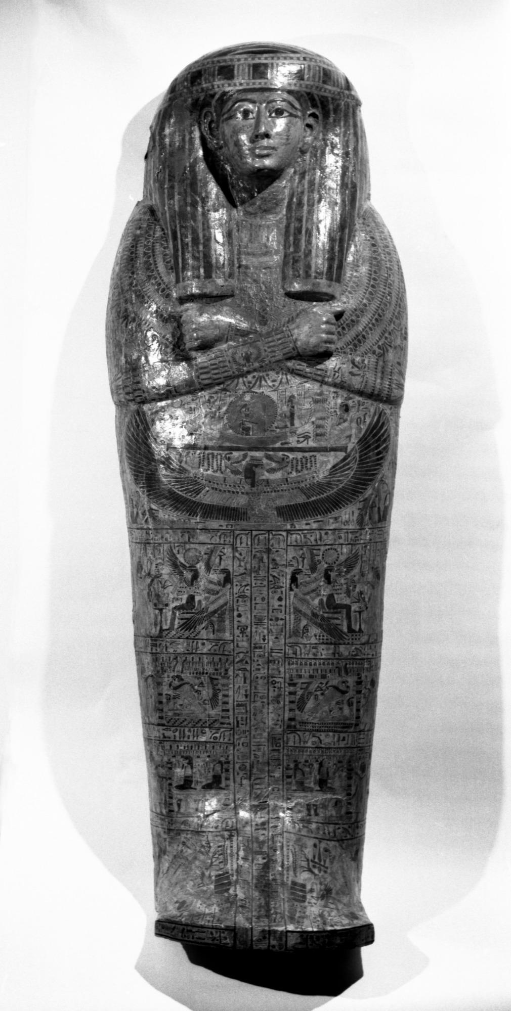 Outer Coffin of Pasebakhaienipet, ca. 1075–945 B.C.E.. Wood (cedar and acacia), gesso, pigment, 37 x 30 1/4 x 83 3/8 in., 287 lb. (94 x 76.8 x 211.8 cm, 130.2kg) Lid: 117.5 lb. (53.3kg) Base: 169.5 lb. (76.9kg) mount (Support and display board, NMK loan): 39 × 93 × 38 in. (99.1 × 236.2 × 96.5 cm). Brooklyn Museum, Charles Edwin Wilbour Fund, 08.480.1a-b. (Photo: Brooklyn Museum)