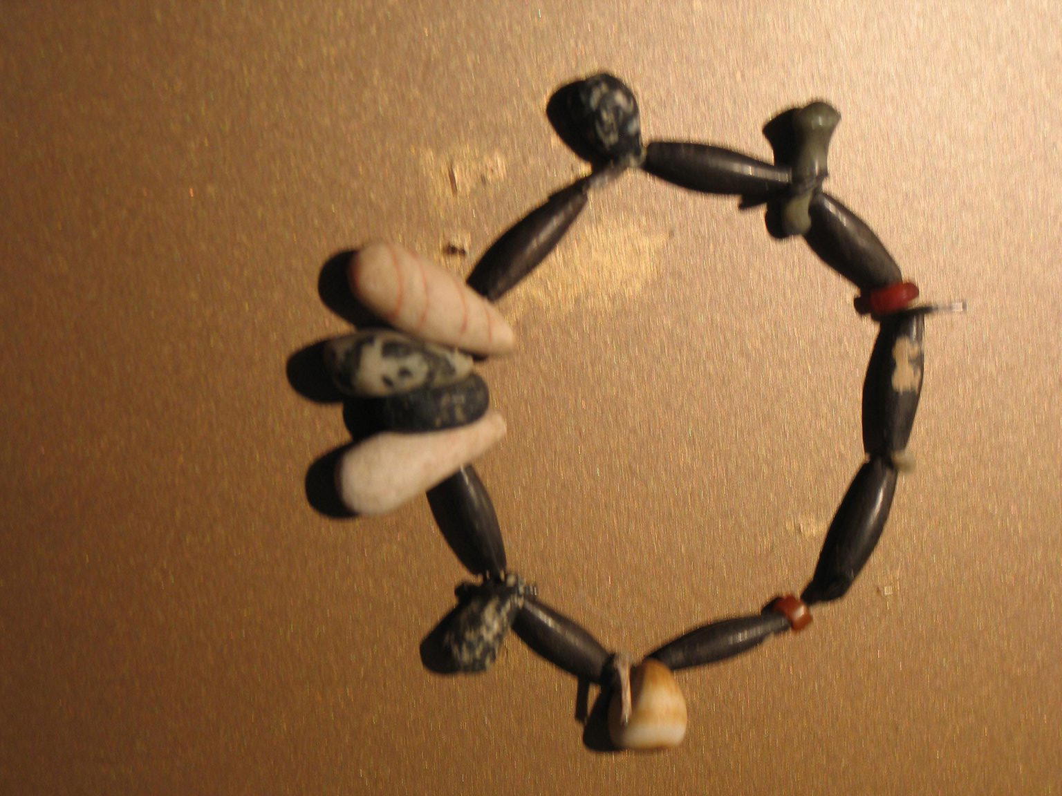 The three necklaces in this case were discovered in graves. Ancient Egyptians apparently wore jewelry not only as adornments but also as protective symbols. Beads of different materials may have been chosen for the symbolic qualities of their colors. The amulet represents the head of a powerful bull—or possibly a nurturing cow—and was probably thought to transfer that animal’s characteristics to its wearer.