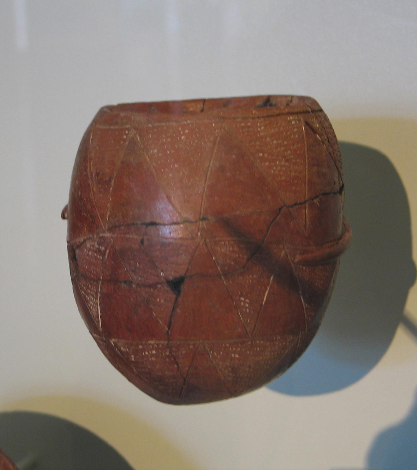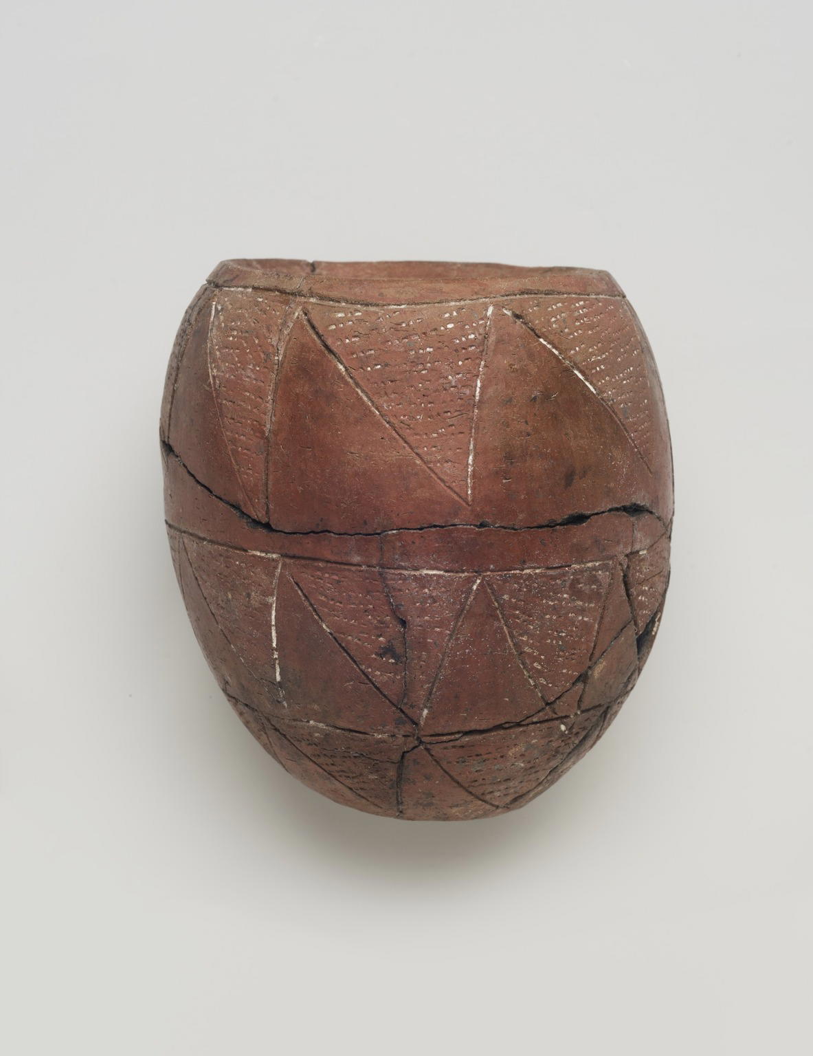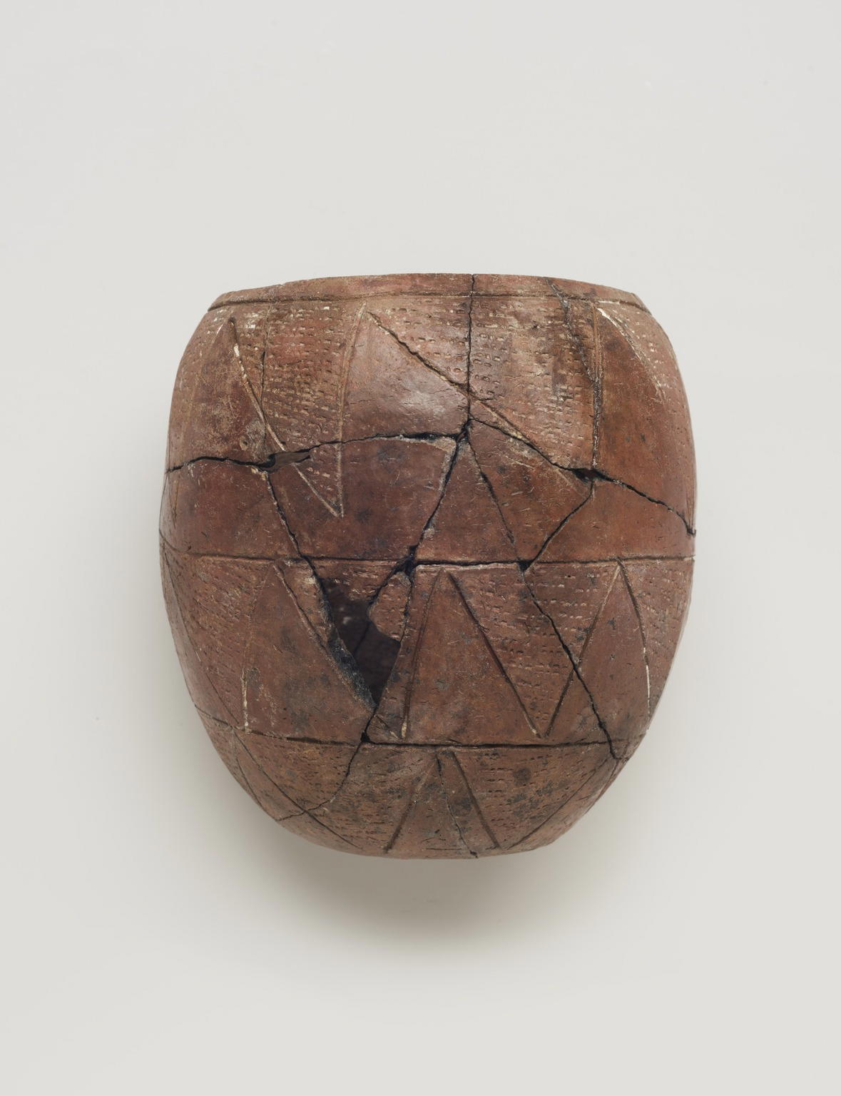 Early Nubian potters often decorated vessels with two or three rows of geometric shapes, usually triangles or squares. Sometimes they added a rhythmic design, as in this example, by using a pointed tool to create dots and dashes.