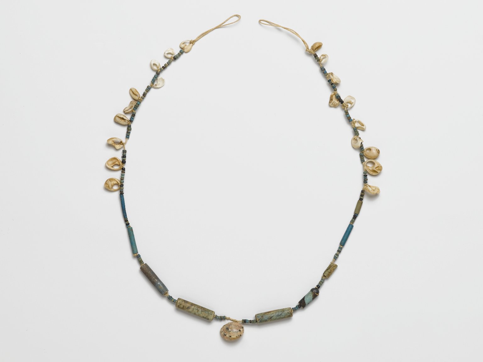 Necklace, ca. 2008–1630 B.C.E.. Faience, shell (marine Cypraea moneta and Xeropicta vestalis), 1/2 x 1/4 x 19 1/8 in. (1.3 x 0.6 x 48.6 cm). Brooklyn Museum, Gift of the Egypt Exploration Society, 26.167. (Photo: Brooklyn Museum)