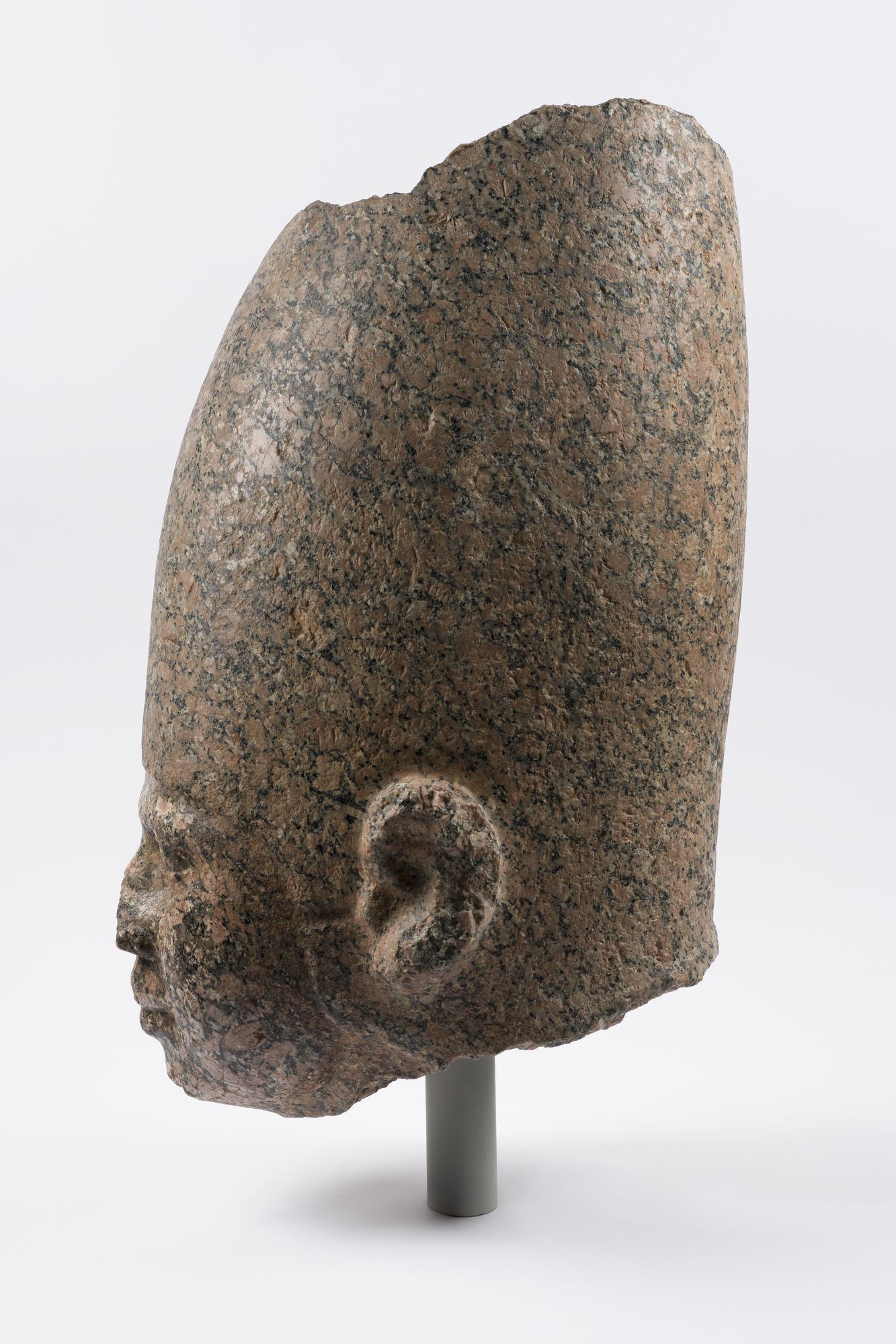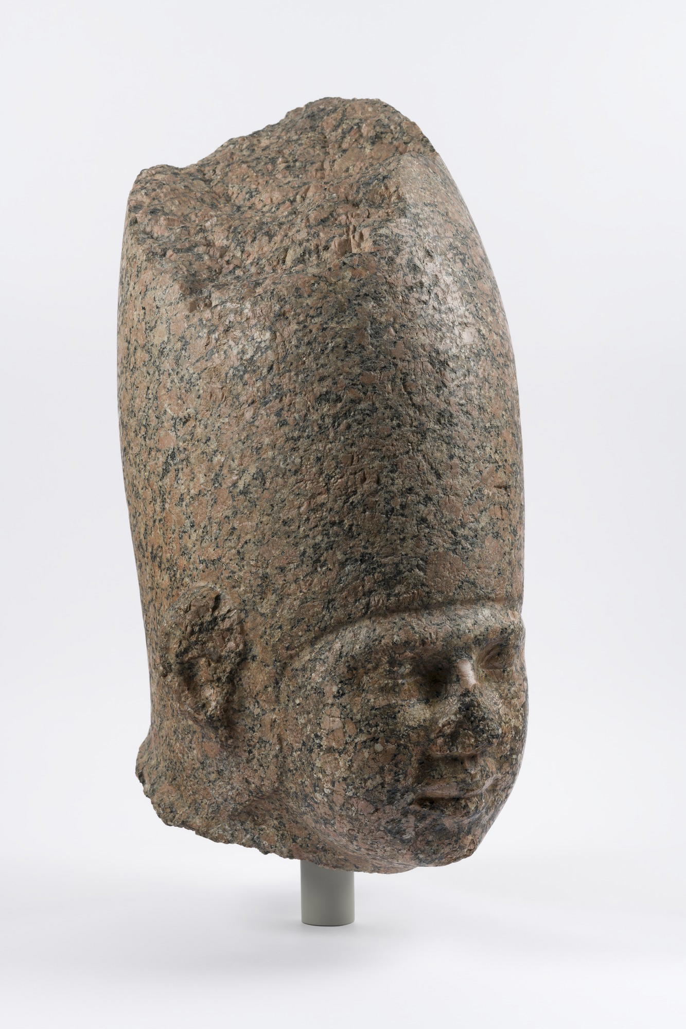 This head depicts a king, that much we know for certain based on the type of crown he's wearing. It was made around the time of the Great Pyramids or a little earlier. It is possible that this dead depicts a king named Huni who ruled in the latter part of the 3rd Dynasty.It's made of granite, an extremely hard stone to carve. Even though we don't know where specifically it stood, or whom exactly it represented, we can still have a sense of what its purpose would have been. A larger-than-life size statue in granite like this one likely comes from a temple or a funerary site.In what year was this carved?