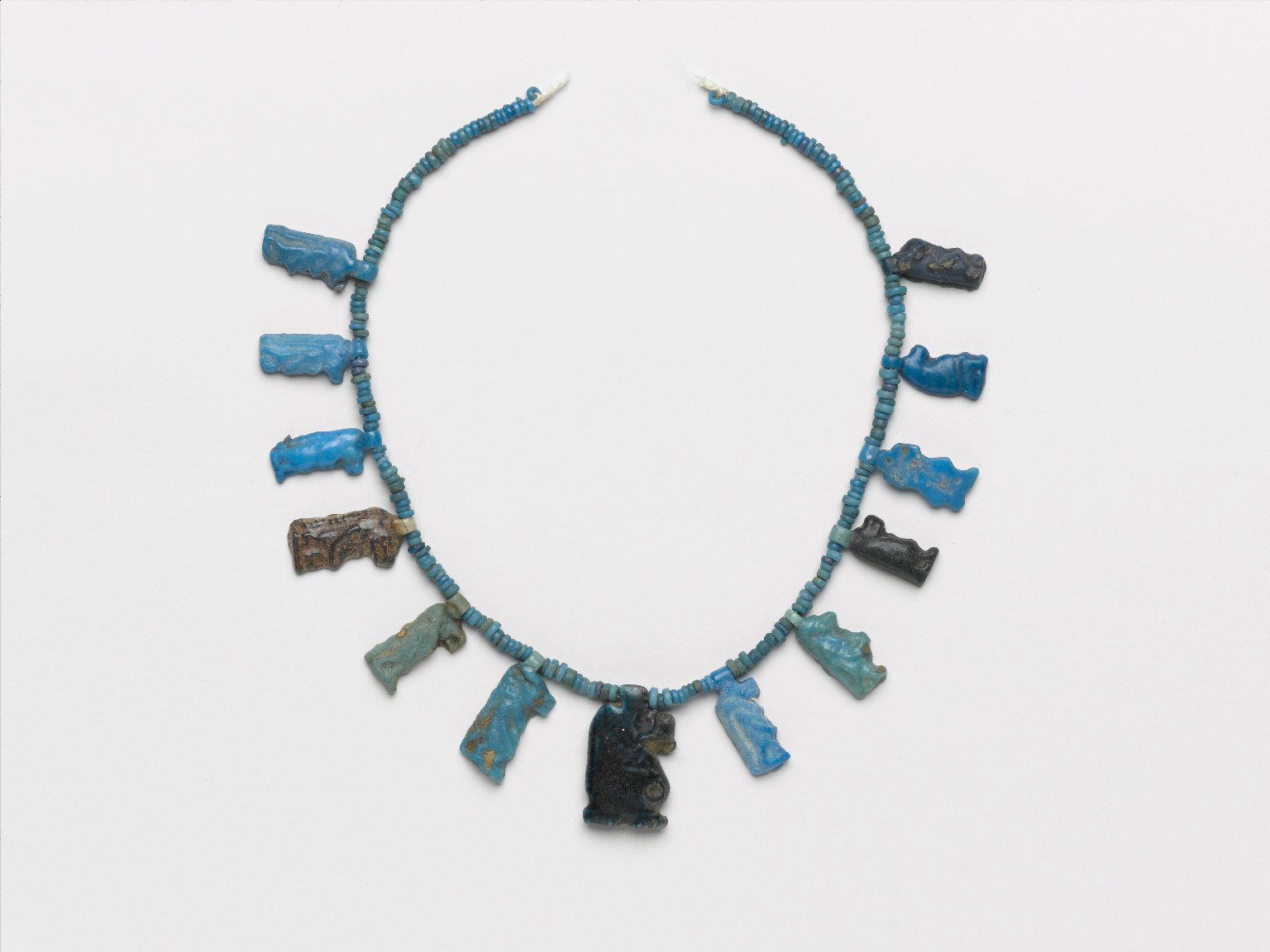 Single-Strand Necklace with Taweret Amulets, ca. 1332–1292 B.C.E.. Faience, 3/4 × 8 1/16 × 3/16 in. (1.9 × 20.5 × 0.4 cm) mount (mounted for 2025 Soulful Creatures tour on padded board.): 1 1/2 × 8 × 8 in. (3.8 × 20.3 × 20.3 cm). Brooklyn Museum, Gift of Mrs. Lawrence Coolidge and Mrs. Robert Woods Bliss, and the Charles Edwin Wilbour Fund, 48.66.42. (Photo: Brooklyn Museum)