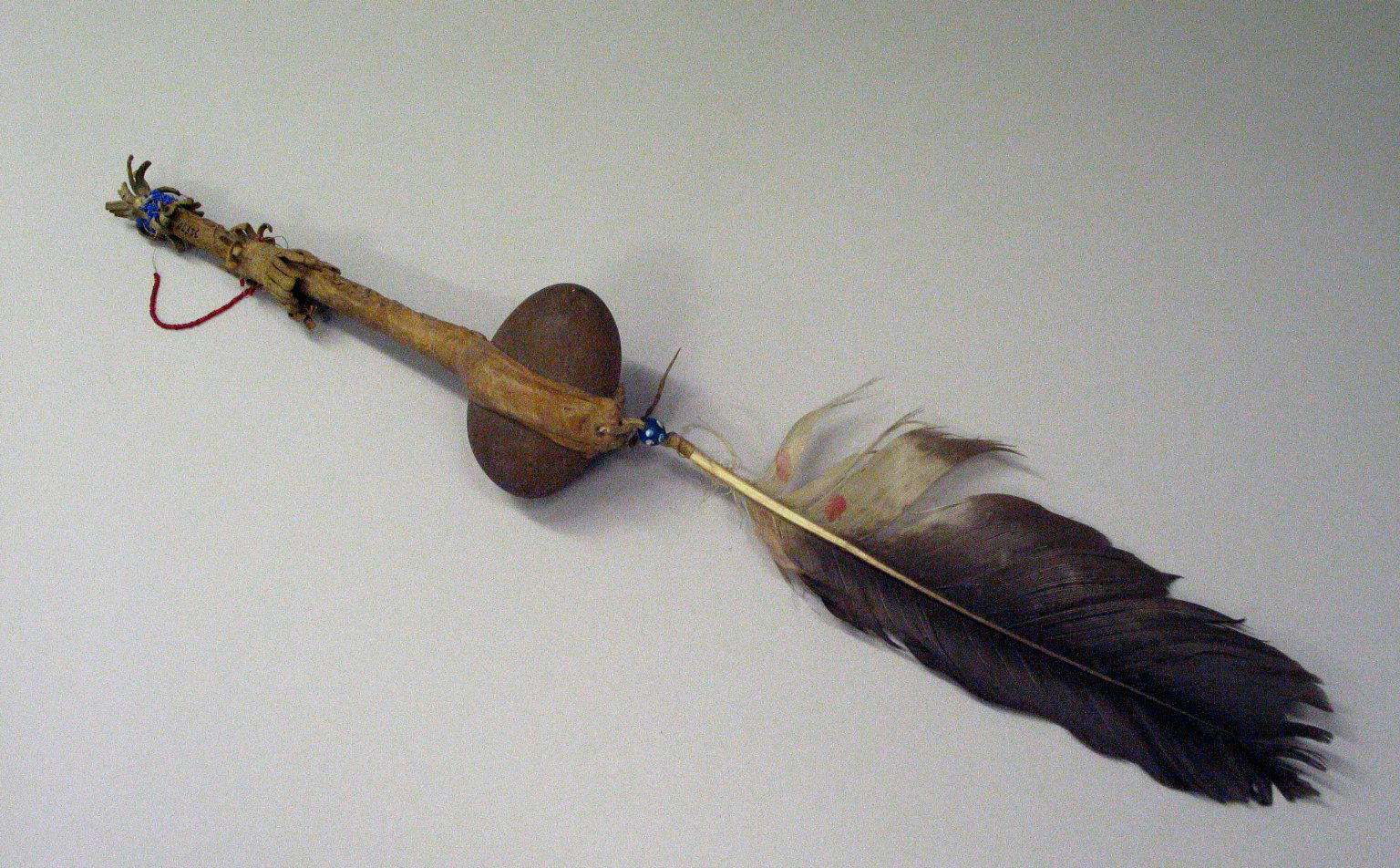 Blackfoot. War Club, 19th century. Stone, wood, hide, feather, beads, 12 1/2 with stone 2 1/2 x 3 1/2 and feather 10 in. (31.8 x 6.4 x 8.9 x 25.4 cm). Brooklyn Museum, Bequest of W.S. Morton Mead, 32.2099.32570. (Photo: Brooklyn Museum)