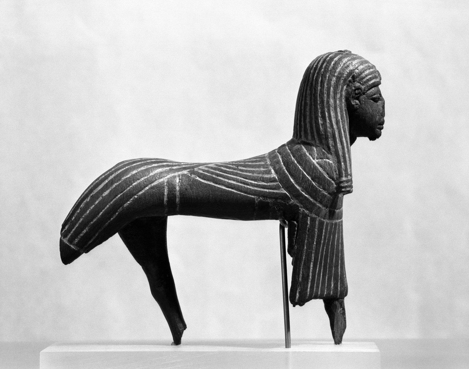 The motif of the king as a superhuman sphinx (human-headed lion) began in the Old Kingdom (circa 2670–2195 B.C.). Sphinxes served as guardians. Often they are shown triumphing over Egypt's enemies, emphasizing the ruler's glory and the divine character of royal authority. The long wings folded over the body probably symbolized swiftness in battle.