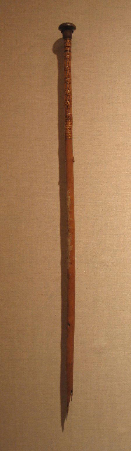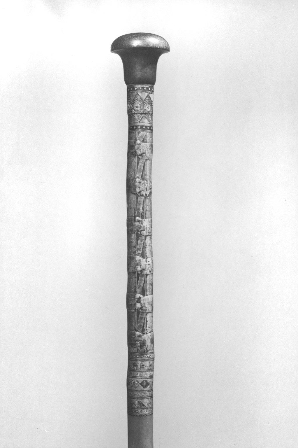 The geometric designs on the upper part of this staff are made of stretched animal skin. The artisan varied the technique of applying the tissue to the staff. In some places the skin is overlaid directly on the wood; in others it is inlaid in minute cavities.