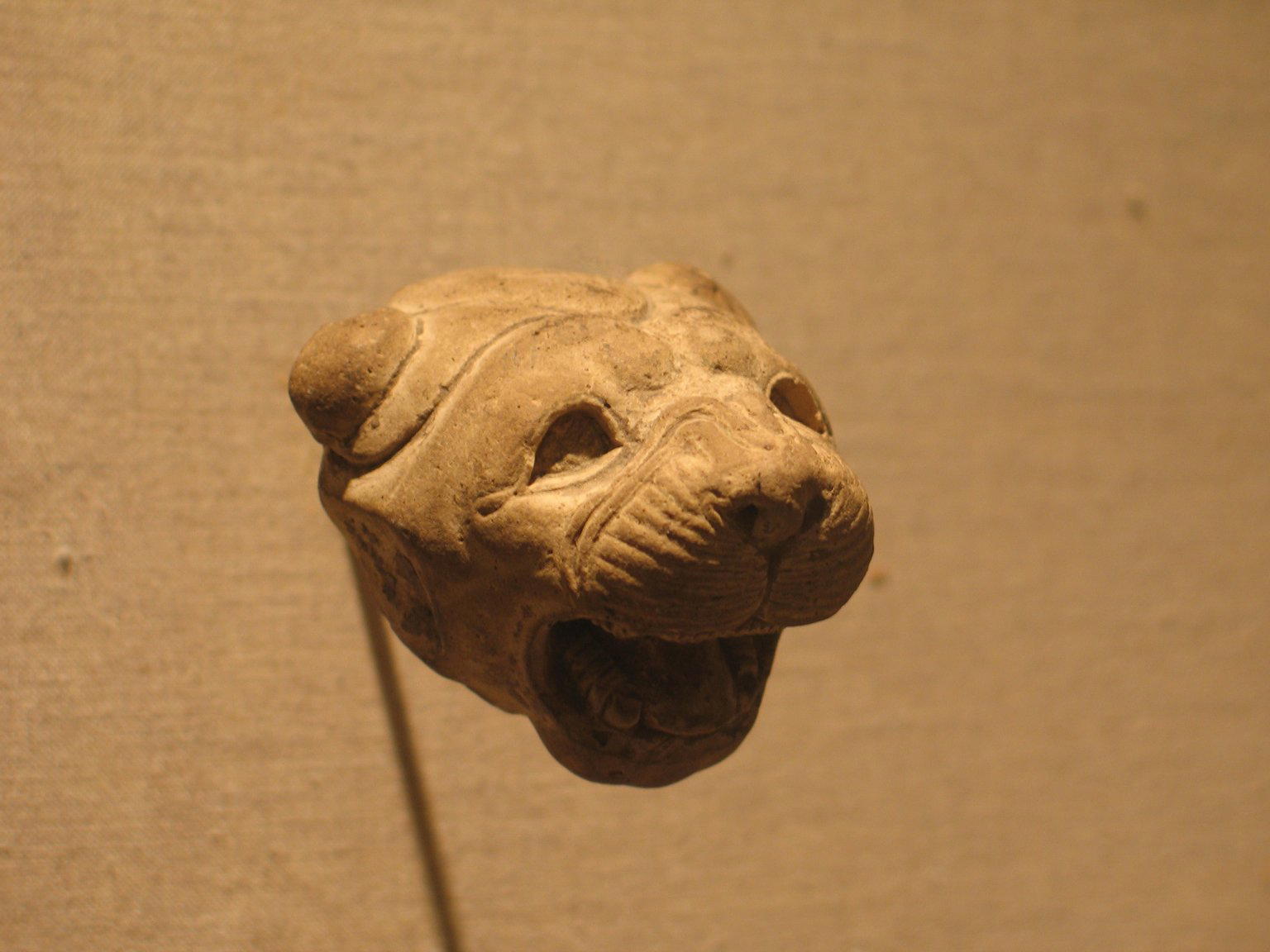 Head of a Lion, ca. 525–404 B.C.E.. Stucco, 2 3/16 x 2 3/16 x 1 3/4 in. (5.6 x 5.5 x 4.4 cm). Brooklyn Museum, Charles Edwin Wilbour Fund, 66.176. (Photo: Brooklyn Museum)