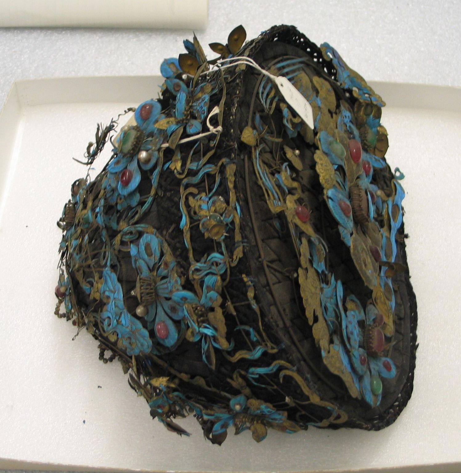 Manchu Princess's Hat (Bride's Hat?), late 19th century. Feather, pearl, semi-precious stone, 6 11/16 x 10 5/8 x 8 1/4 x 9 7/16 in. (17 x 27 x 21 x 24 cm). Brooklyn Museum, Brooklyn Museum Collection, 34.924. (Photo: Brooklyn Museum)