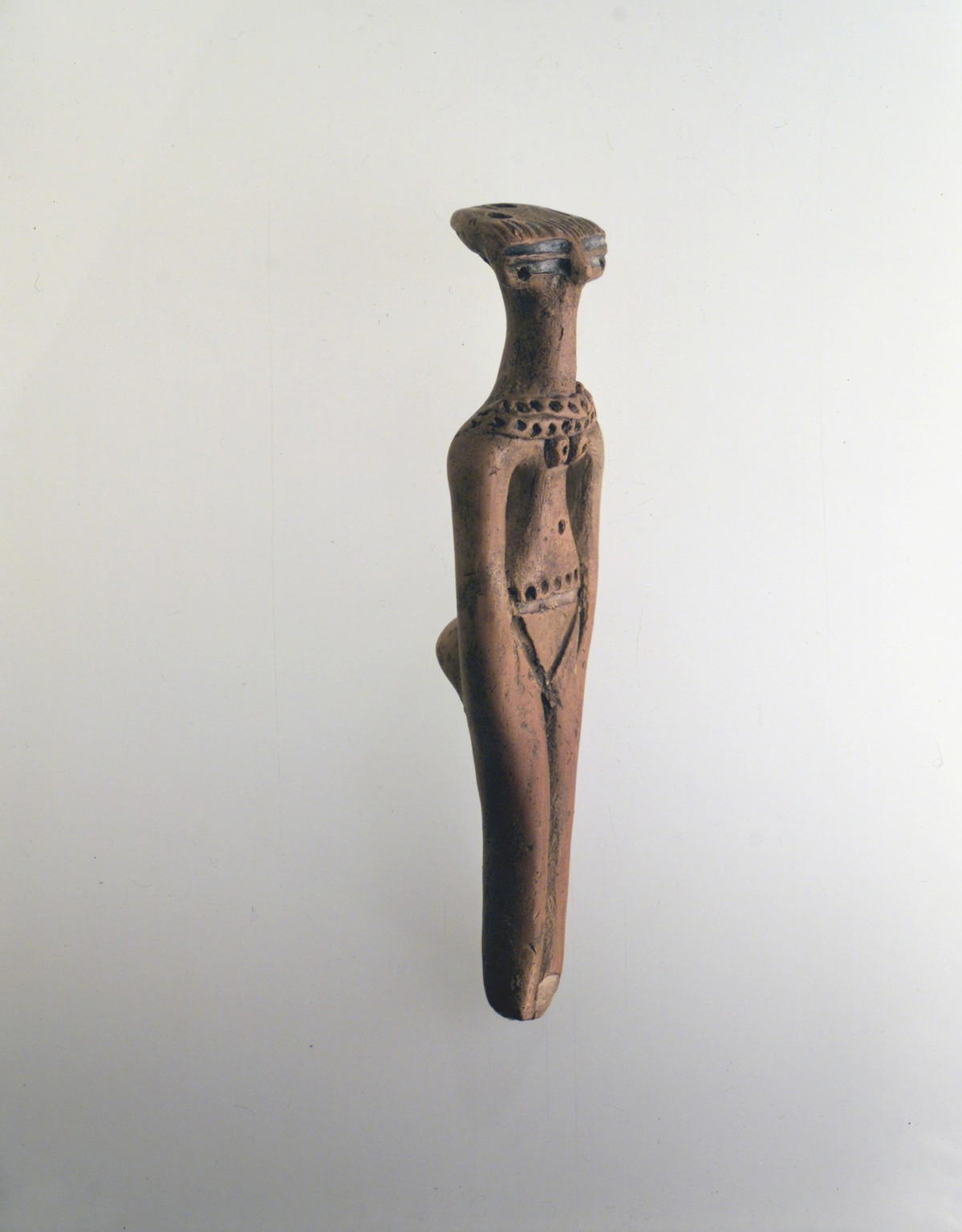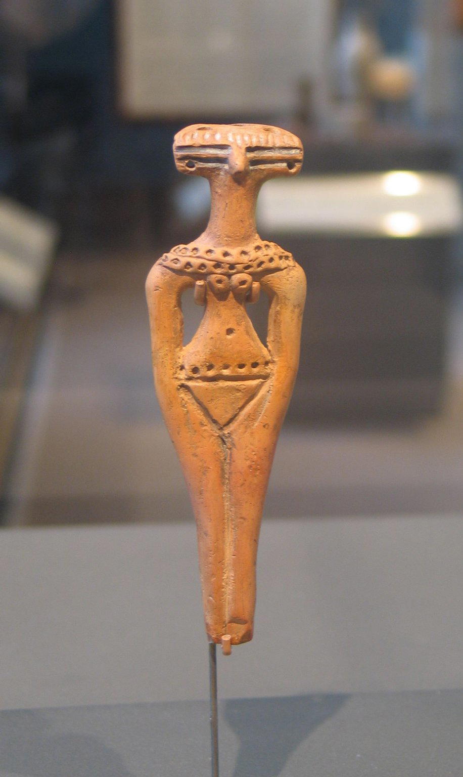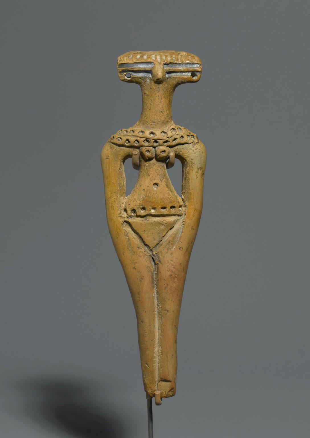 Schematic Female Figurine, ca. 1630–1539 B.C.E.. Clay, pigment, 4 3/4 x 1 7/16 x 9/16 in. (12 x 3.7 x 1.5 cm). Brooklyn Museum, Charles Edwin Wilbour Fund, 77.49. (Photo: Brooklyn Museum)