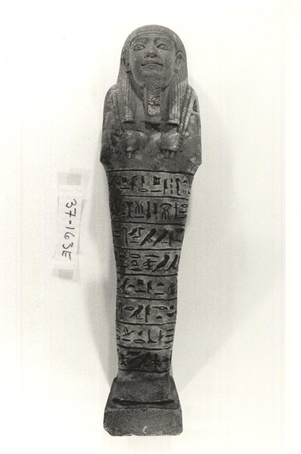 The Egyptians manufactured funerary figurines, originally called shabties, as early as Dynasty 12 (1932–1759 B.C.E.). The earliest shabties are inscribed with either the deceased’s name (see nos. 1 and 2) or a simple form of Chapter 6 of the Book of the Dead. The rarity and high quality of the early shabties suggest that they were costly items produced for privileged persons.