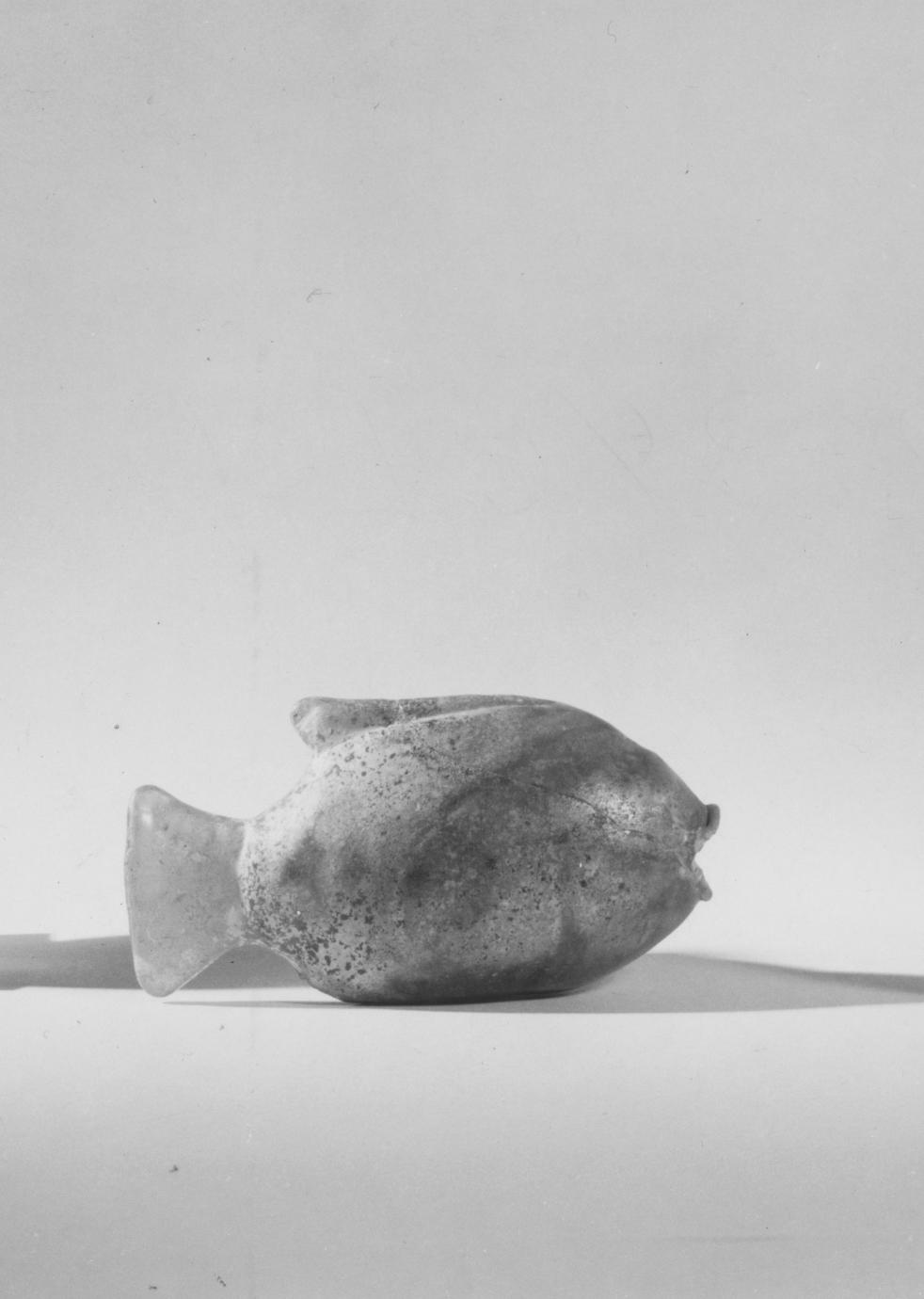 Fish Flask, ca. 1390–1292 B.C.E.. Glass, 2 1/4 × 4 3/8 × 1 5/8 in. (5.7 × 11.1 × 4.1 cm) mount (m2): 7 × 4 1/4 × 1 1/2 in. (17.8 × 10.8 × 3.8 cm). Brooklyn Museum, Charles Edwin Wilbour Fund, 37.316E. (Photo: Brooklyn Museum)