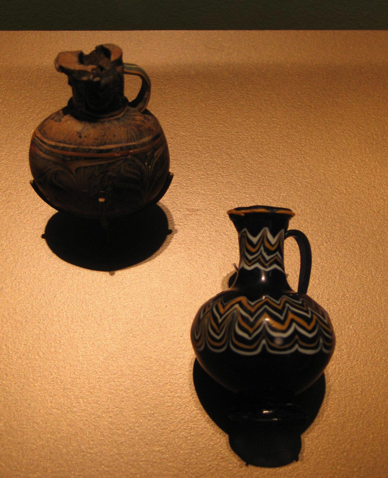 Ancient Egyptian artists produced vessels in both glass and faience, producing different effects with each material.