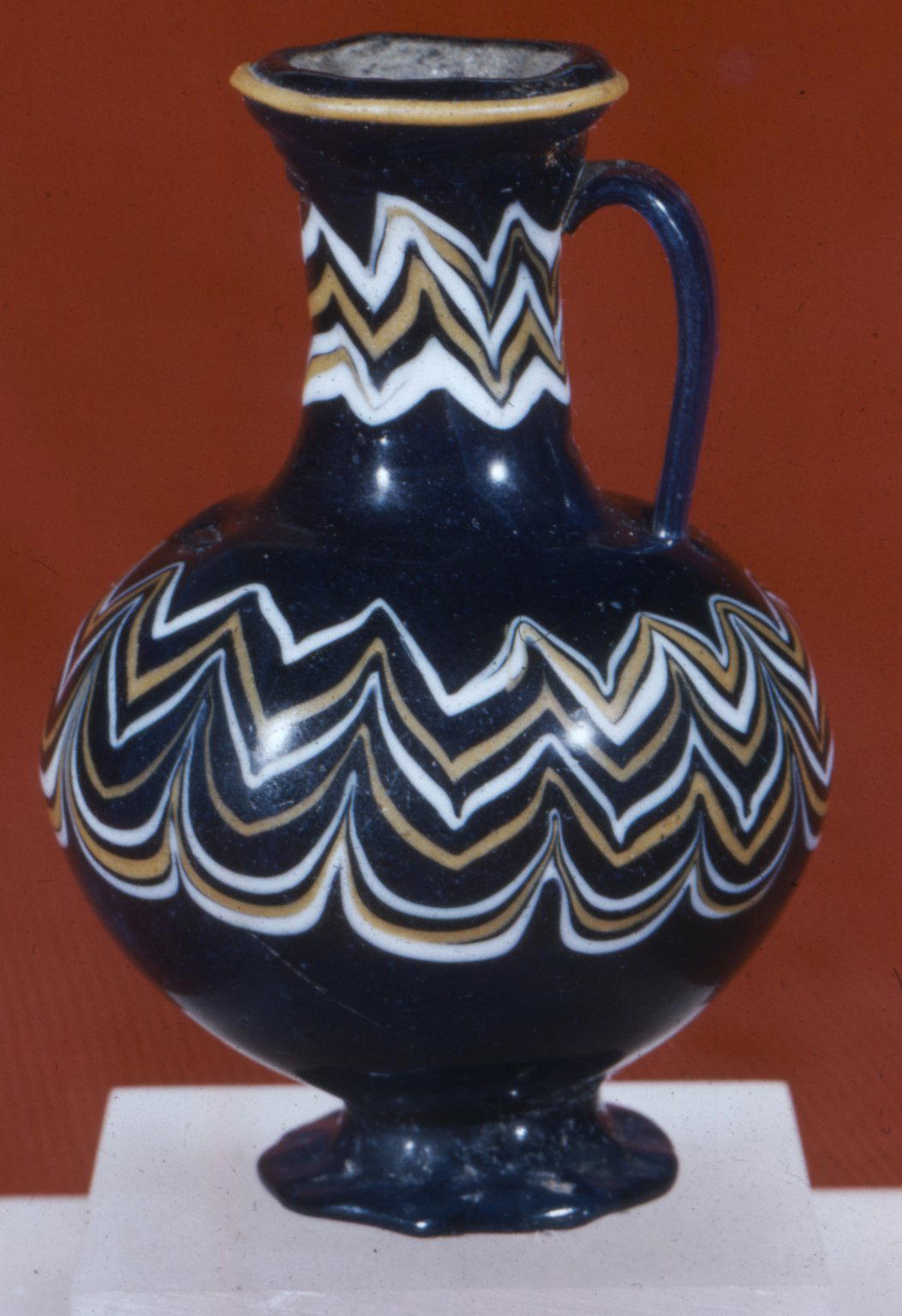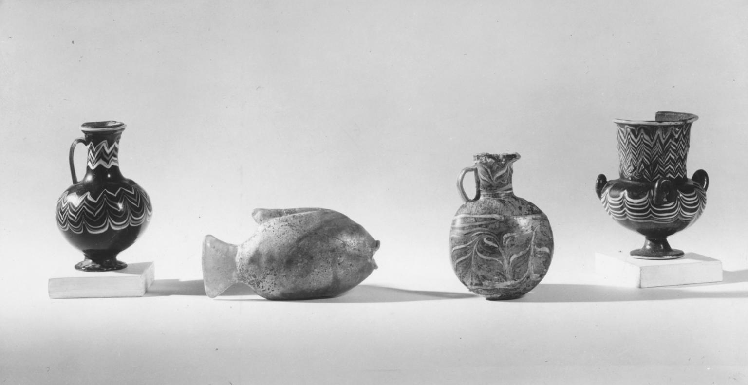 The Egyptians began manufacturing glass vessels during the Eighteenth Dynasty reign of Thutmose III (circa 1479–1425 B.C.E.). Early examples, valued for their rarity and beauty, were luxury items used to store precious oils and perfumes. Craftsmen produced striking effects by adding threads of colored glass to a vessel’s surface while it was still hot and then dragging a pointed object across the surface to produce festooned patterns. The artist who made the fish flask shown here indicated the animal’s scales by pressing blue powdered glass down into the interior.