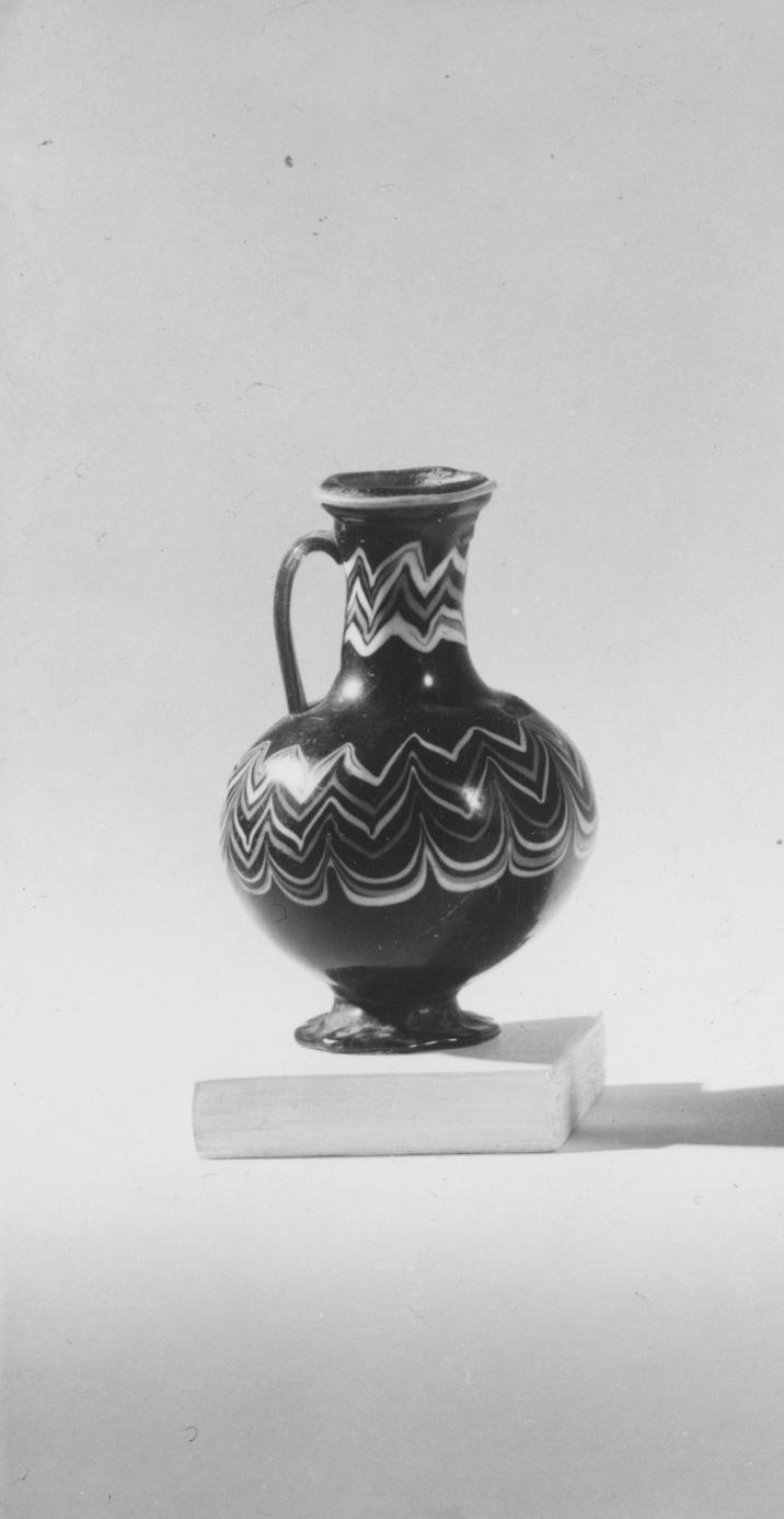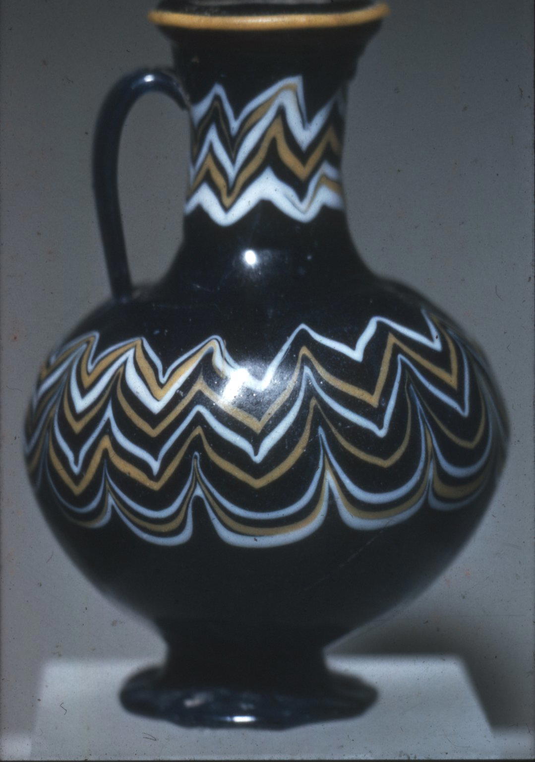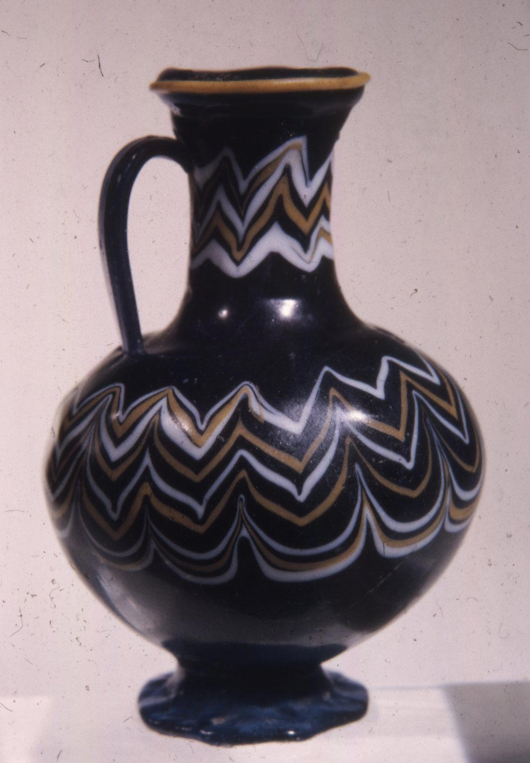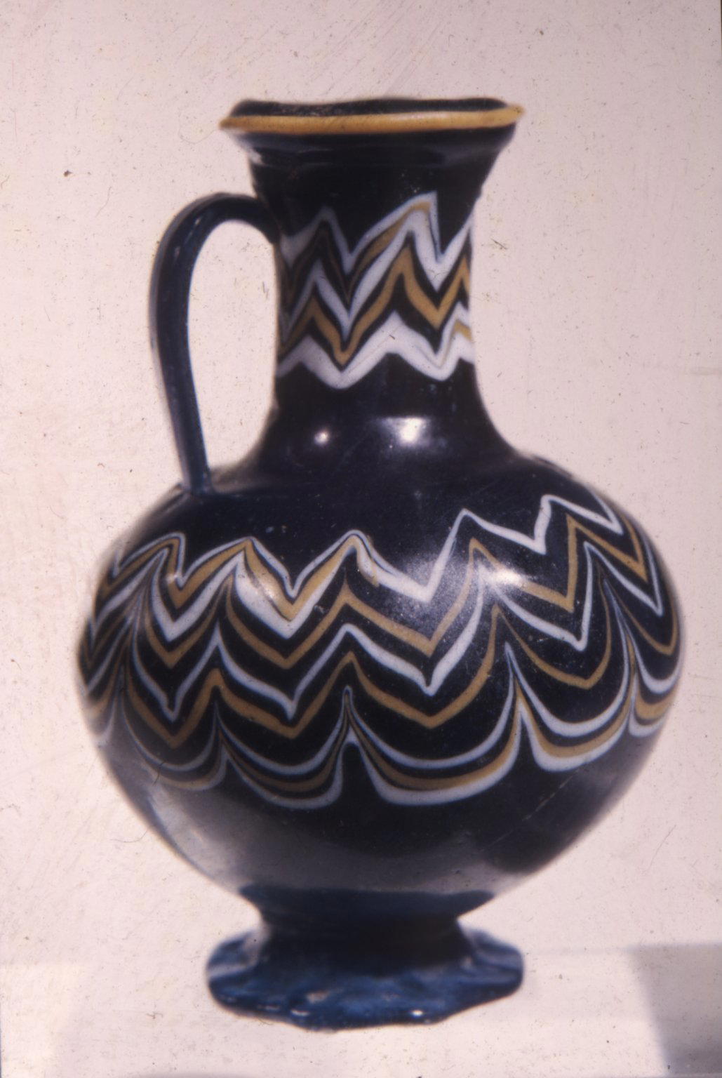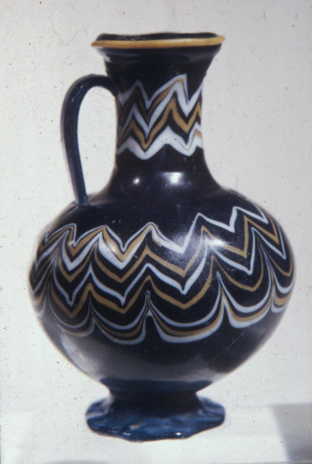 Polychrome Core-formed Bottle with Festooned Design, ca. 1390–1336 B.C.E.. Glass, 3 3/8 x Diam. 2 7/16 in. (8.6 x 6.2 cm). Brooklyn Museum, Charles Edwin Wilbour Fund, 37.341E. (Photo: Brooklyn Museum)