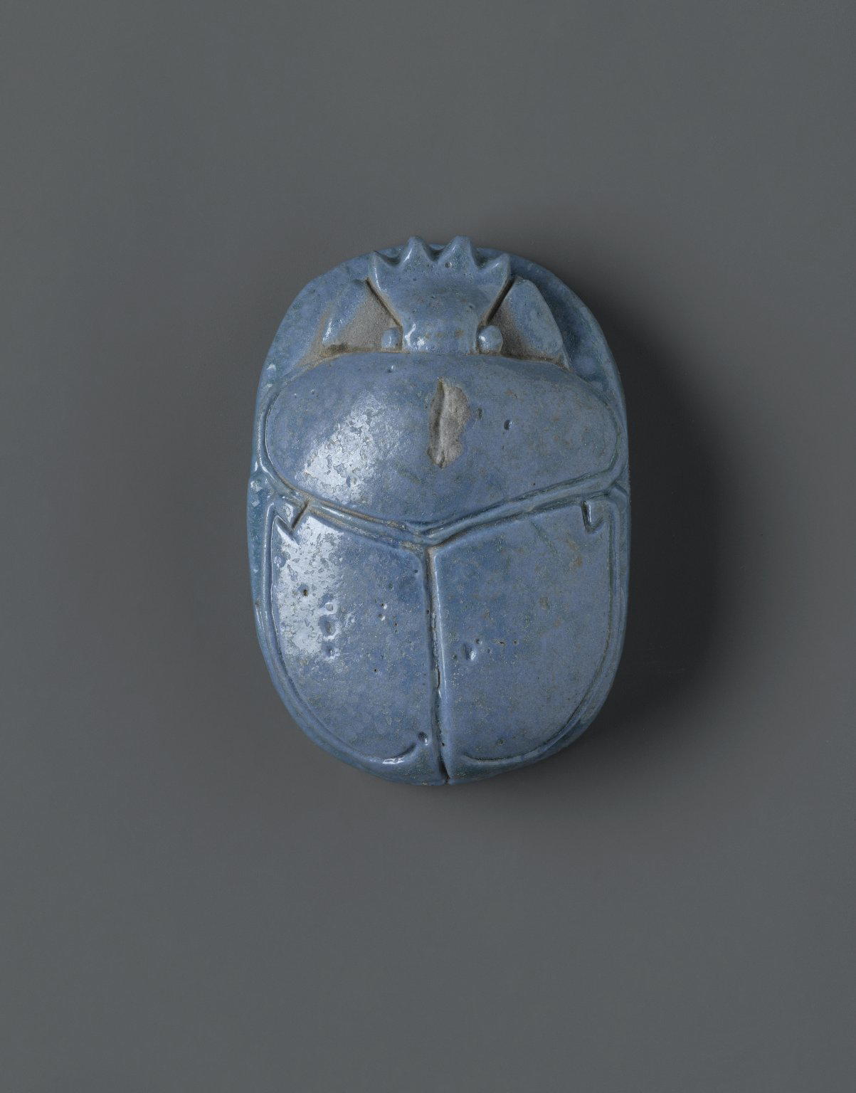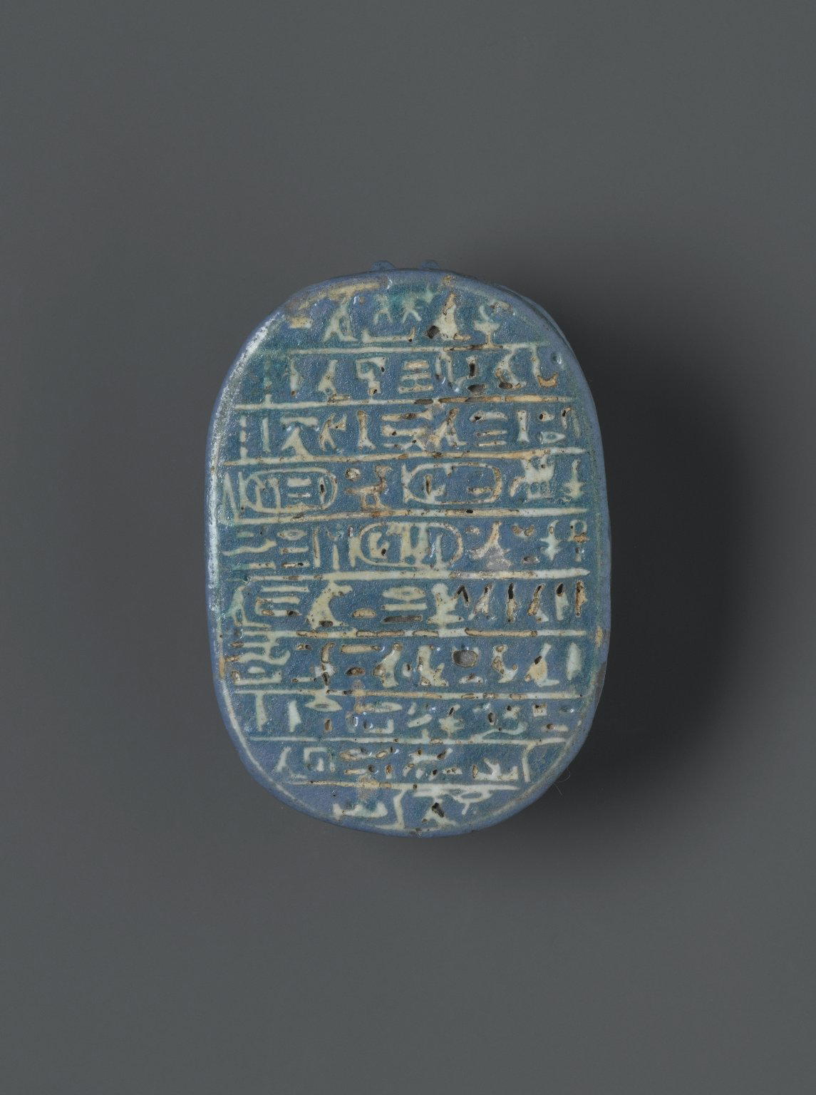 "Marriage Scarab" of Amunhotep III and Queen Tiye, ca. 1390–1353 B.C.E.. Faience, 1 1/8 x 1 15/16 x 2 3/4 in. (2.8 x 5 x 7 cm). Brooklyn Museum, Charles Edwin Wilbour Fund, 37.475E. (Photo: Brooklyn Museum)