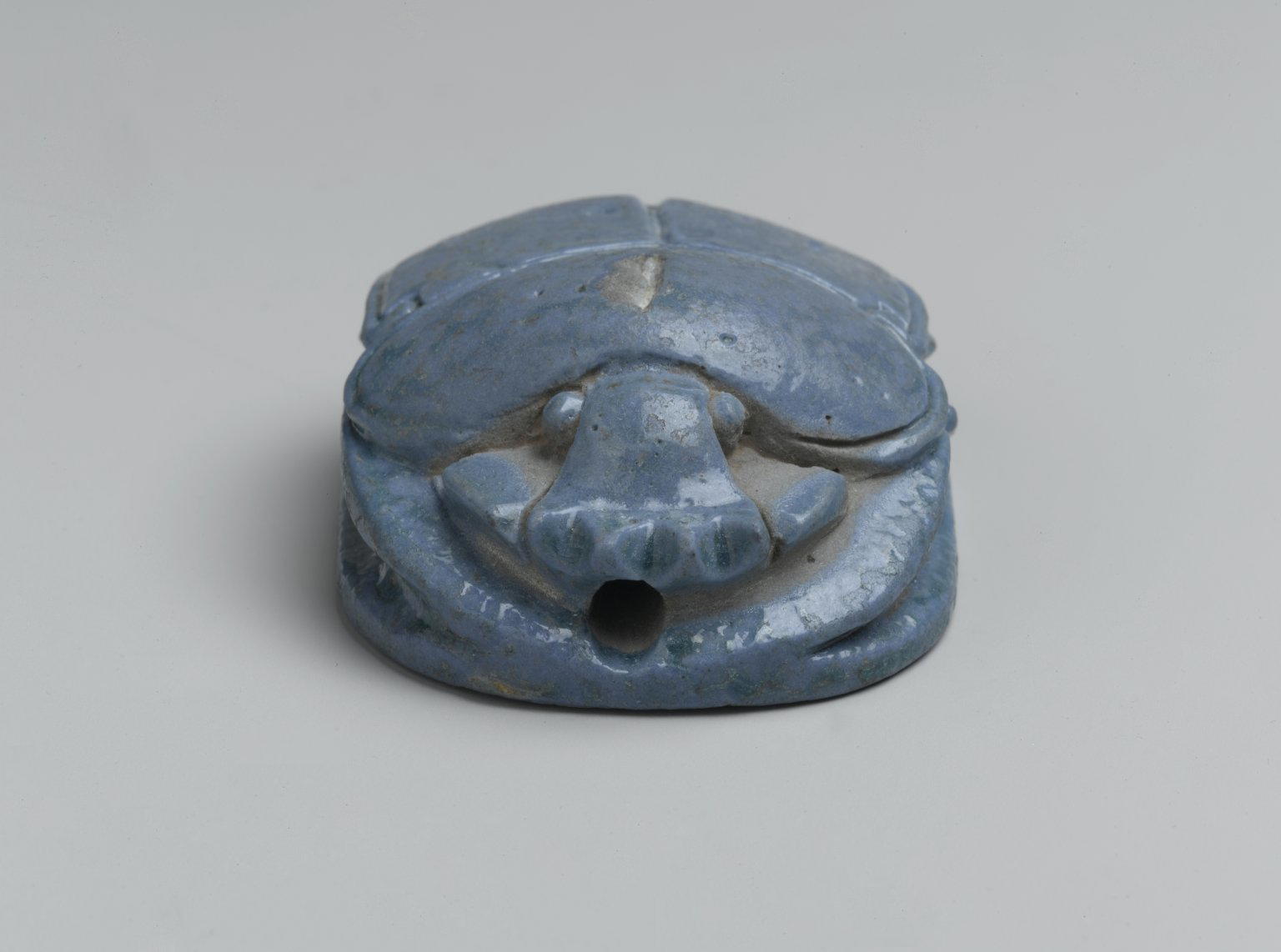 Scarabs represented, to the Egyptians, the cycle of the sun, rebirth, and the god Khepri. Just as scarabs rolled balls of dung filled with their eggs around the desert, the Egyptians believed that a similar beetle rolled the sun in the sky. Because of this symbolism, sculptures of scarab beetles became very popular for seals and inscriptions. This one commemorates the marriage of King Amunhotep III and Queen Tiye.