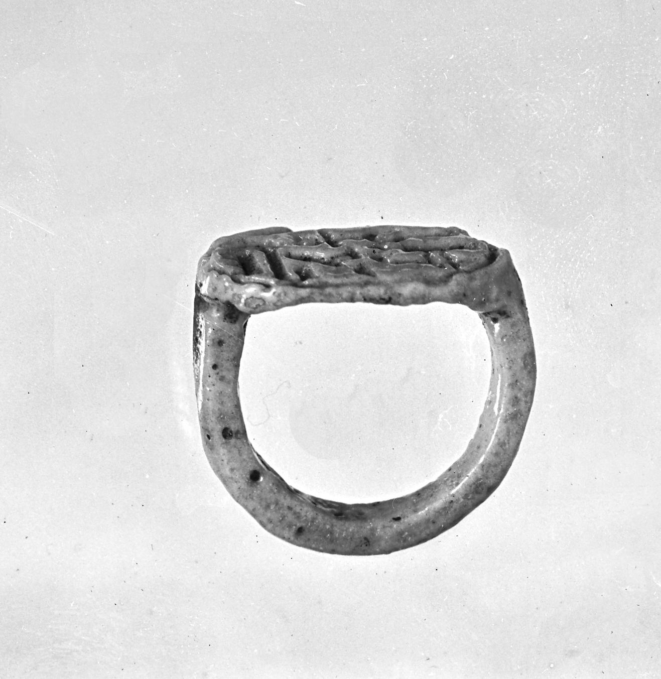 Signet Ring Bearing Cartouche of Tutankhamun, ca. 1329–1322 B.C.E.. Faience, 13/16 × 1/2 × 3/4 in. (2 × 1.2 × 1.9 cm) mount: 7/8 × 1/2 × 1 1/2 in. (2.2 × 1.3 × 3.8 cm). Brooklyn Museum, Charles Edwin Wilbour Fund, 37.889E. (Photo: Brooklyn Museum)