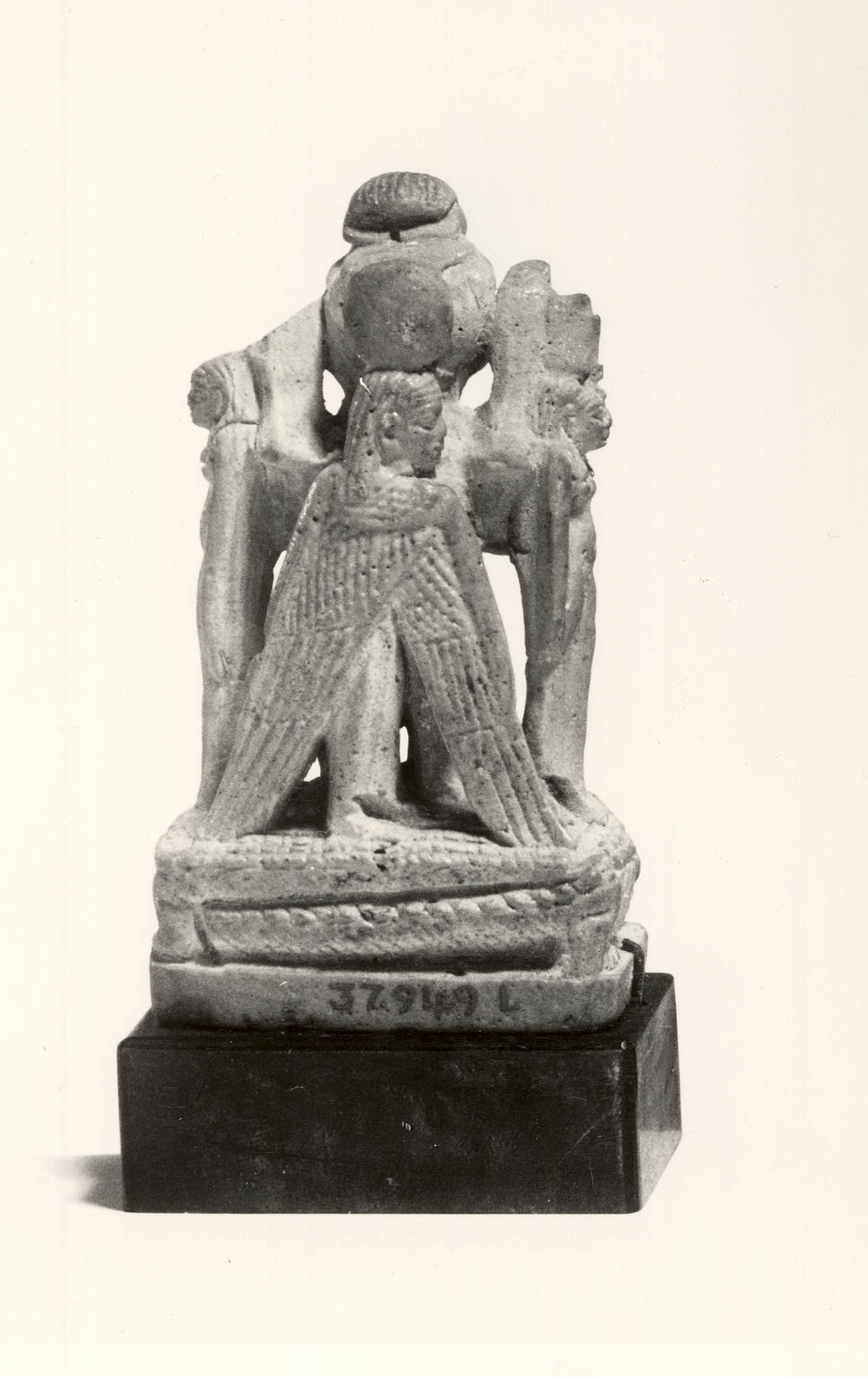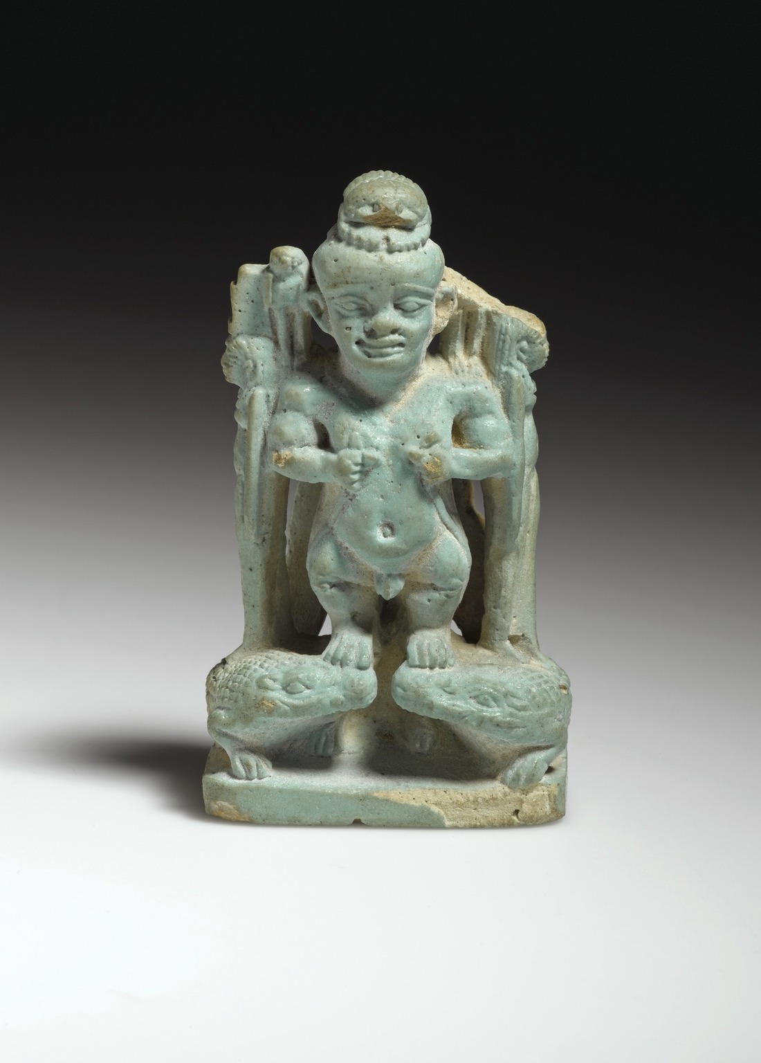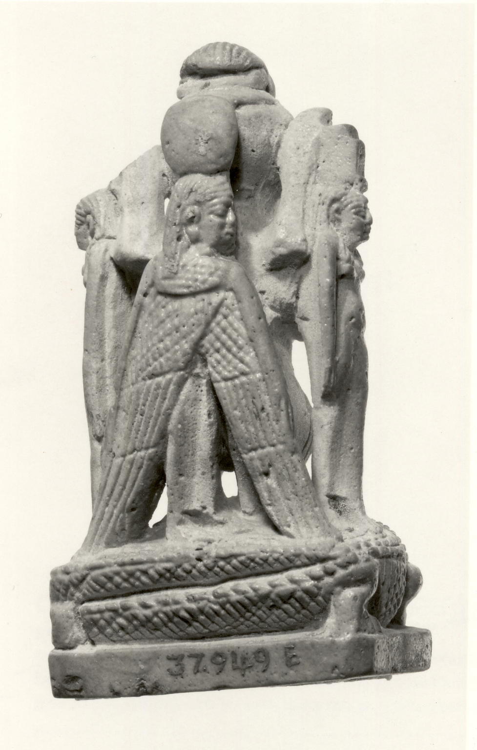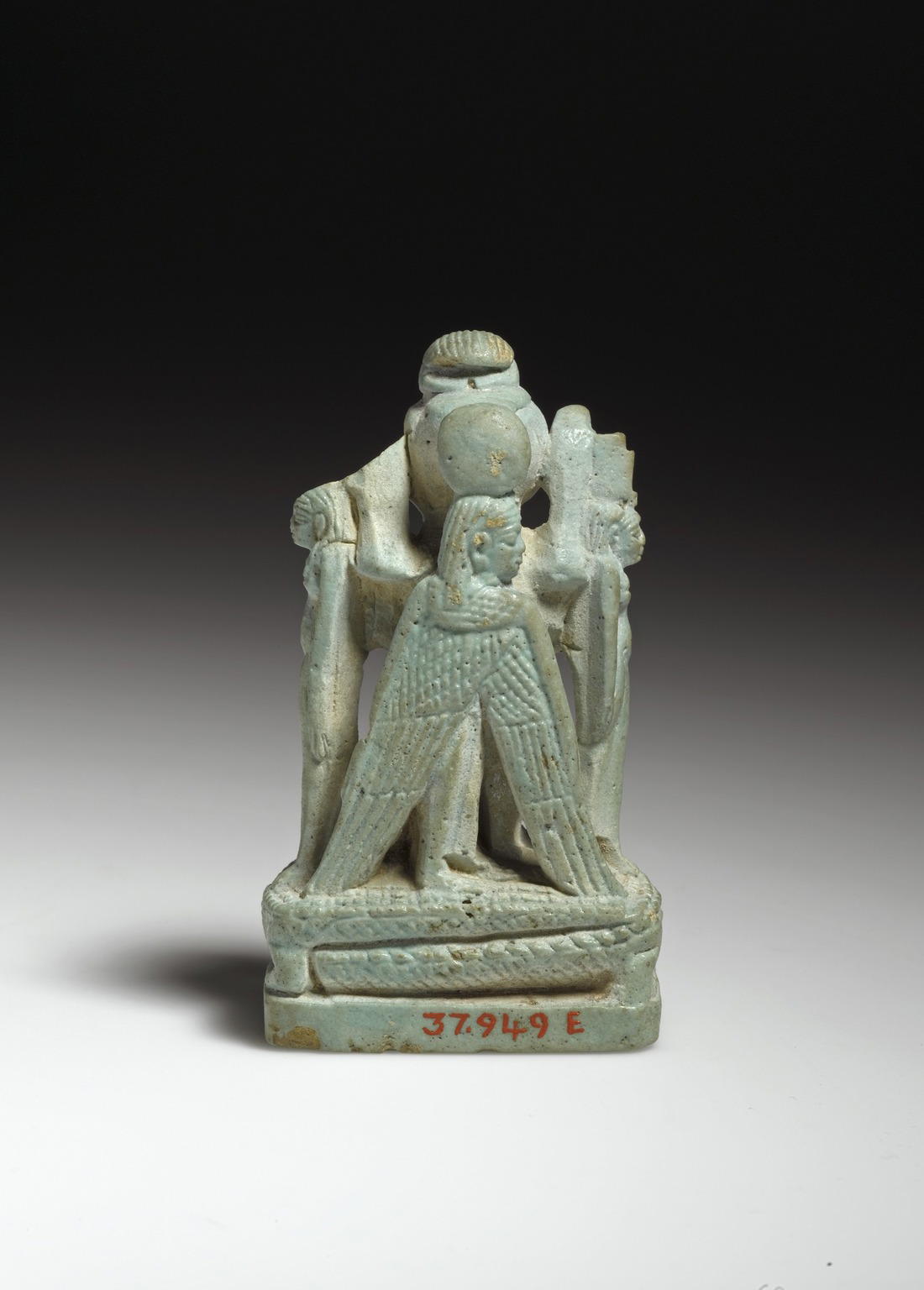 Amulet of Pataikos Flanked by Goddesses, 664–30 B.C.E.. Faience, 2 15/16 x 1 11/16 x 1 in. (7.5 x 4.3 x 2.5 cm). Brooklyn Museum, Charles Edwin Wilbour Fund, 37.949E. (Photo: Brooklyn Museum)