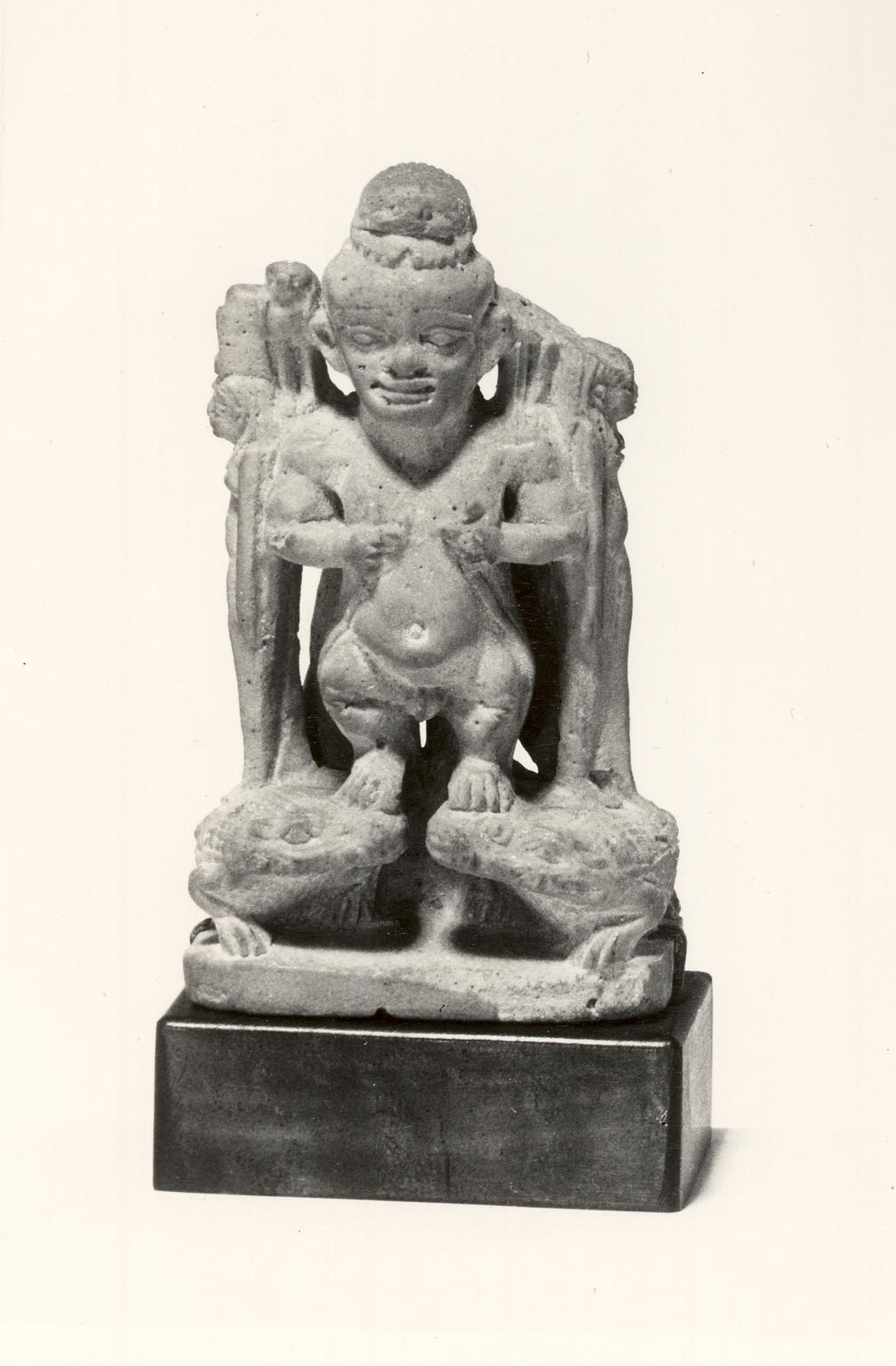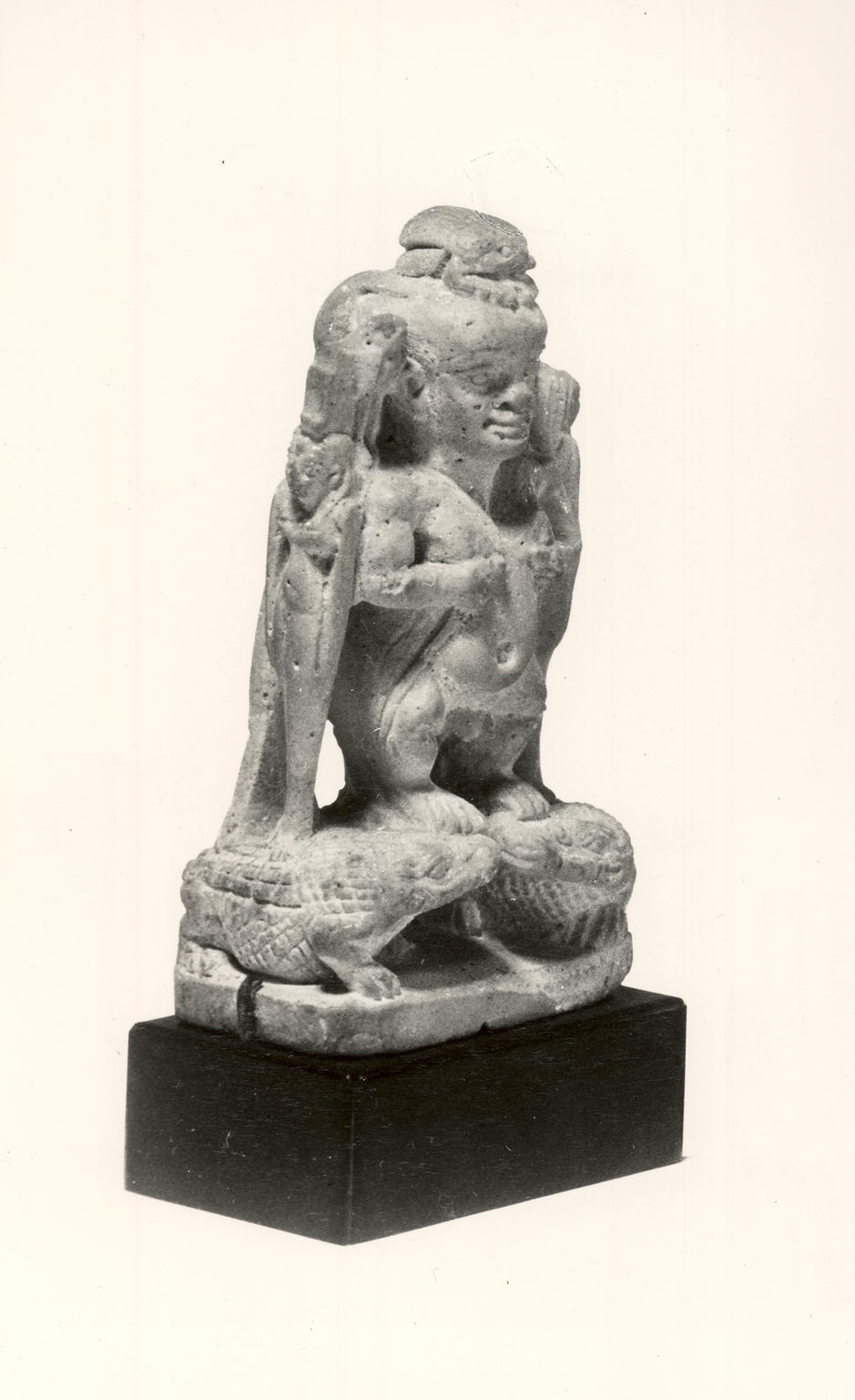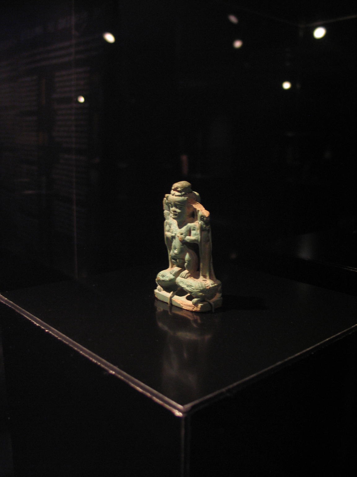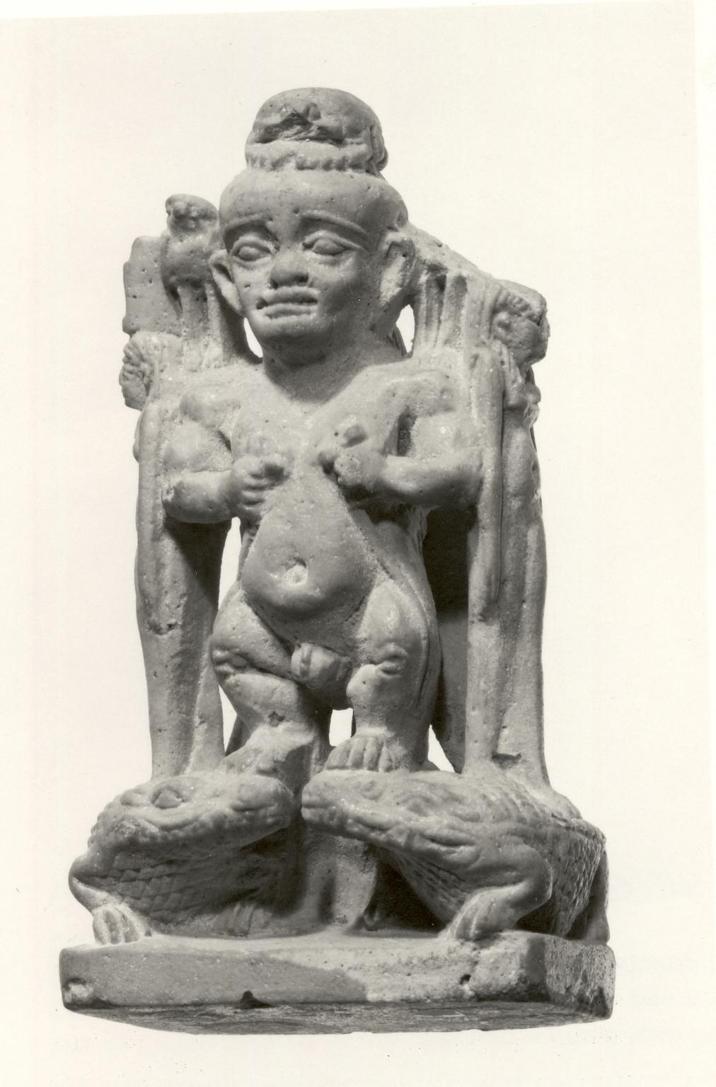 Amulet of Pataikos Flanked by Goddesses, 664–30 B.C.E.. Faience, 2 15/16 x 1 11/16 x 1 in. (7.5 x 4.3 x 2.5 cm). Brooklyn Museum, Charles Edwin Wilbour Fund, 37.949E. (Photo: Brooklyn Museum)