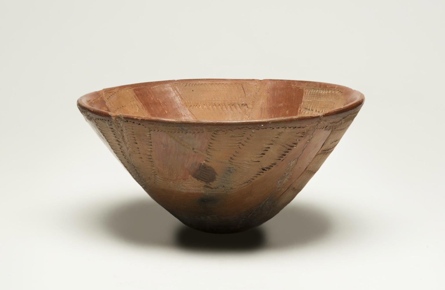 Nubian. Bowl with Alternate Impressed and Red-polished Panels, ca. 3500–3300 B.C.E.. Clay, 3 1/2 x 7 9/16 in. (8.9 x 19.2 cm) mount (m2 - overall): 3 3/4 × 7 1/2 × 7 1/2 in. (9.5 × 19.1 × 19.1 cm). Brooklyn Museum, Charles Edwin Wilbour Fund, 07.447.404. (Photo: Brooklyn Museum)